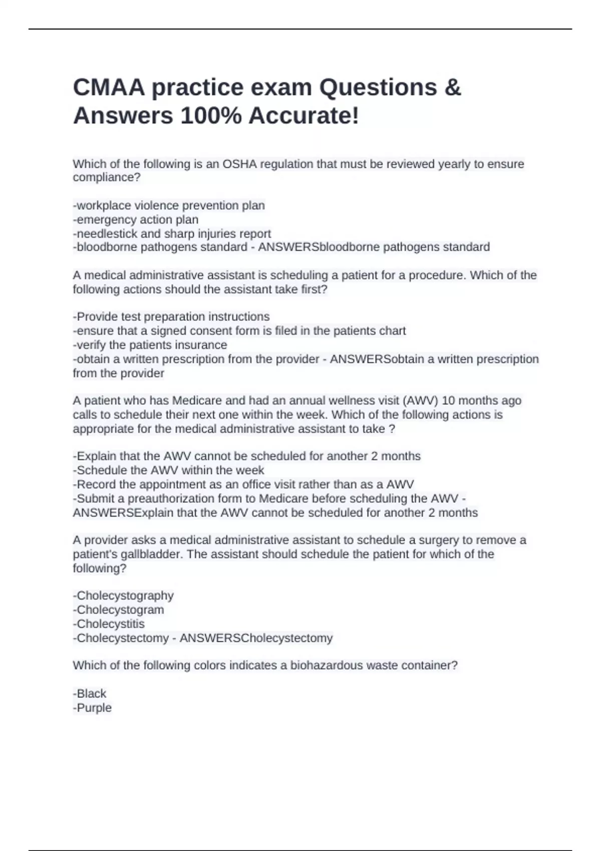 Which of the following is an OSHA regulation that must be reviewed yearly to ensure compliance? -workplace violence prevention plan -emergency action plan -needlestick and sharp injuries report -bloodborne pathogens standard - ANSWERSbloodborne pathogens standard A medical administrative assistant is scheduling a patient for a procedure. Which of the following actions should the assistant take first? -Provide test preparation instructions -ensure that a signed consent form is filed in the patients chart -verify the patients insurance -obtain a written prescription from the provider - ANSWERSobtain a written prescription from the provider A patient who has Medicare and had an annual wellness visit (AWV) 10 months ago calls to schedule their next one within the week. Which of the following actions is appropriate for the medical administrative assistant to take ? -Explain that the AWV cannot be scheduled for another 2 months -Schedule the AWV within the week -Record the appointment as an office visit rather than as a AWV -Submit a preauthorization form to Medicare before scheduling the AWV - ANSWERSExplain that the AWV cannot be scheduled for another 2 months A provider asks a medical administrative assistant to schedule a surgery to remove a patient's gallbladder. The assistant should schedule the patient for which of the following? -Cholecystography -Cholecystogram -Cholecystitis -Chol