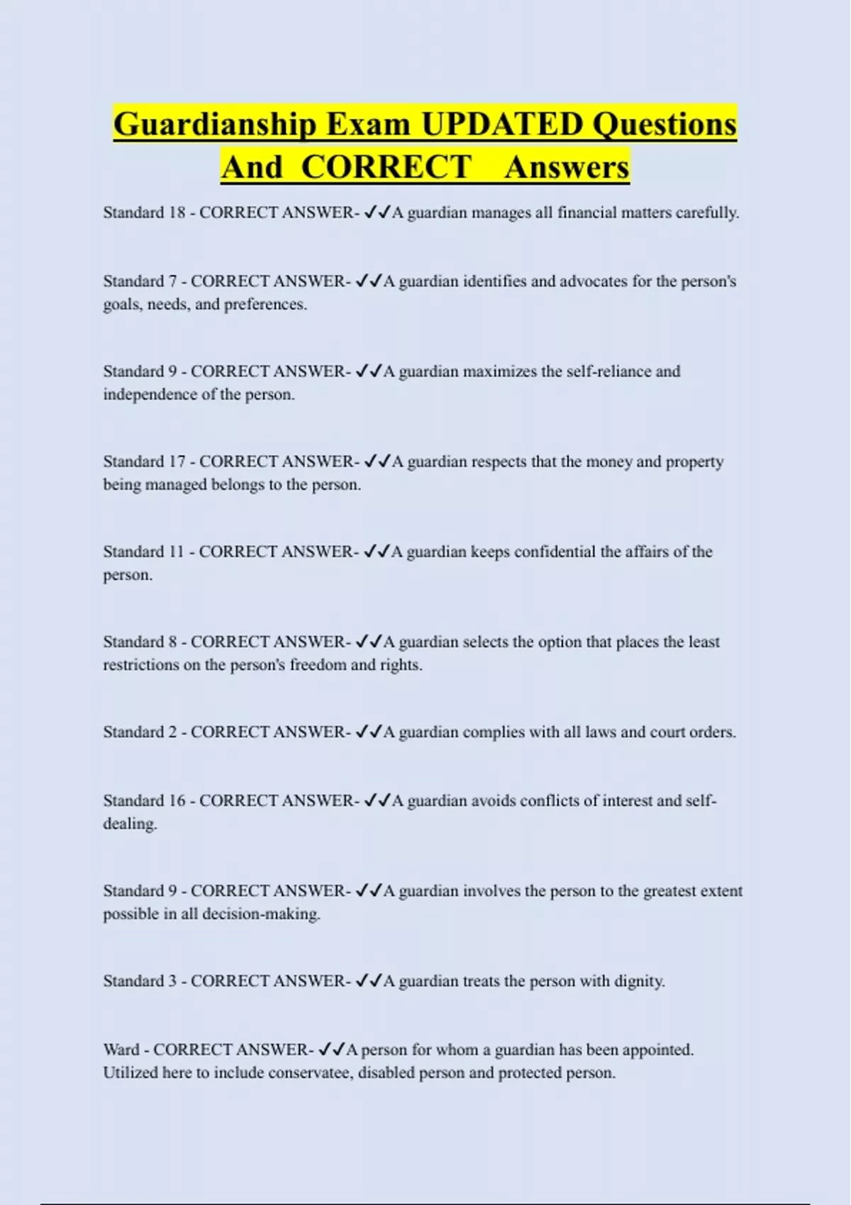 Guardianship Exam UPDATED Questions And CORRECT Answers Standard 18 - CORRECT ANSWER- A guardian manages all financial matters carefully. Standard 7 - CORRECT ANSWER- A guardian identifies and advocates for the person's goals, needs, and preferences. Standard 9 - CORRECT ANSWER- A guardian maximizes the self-reliance and independence of the person