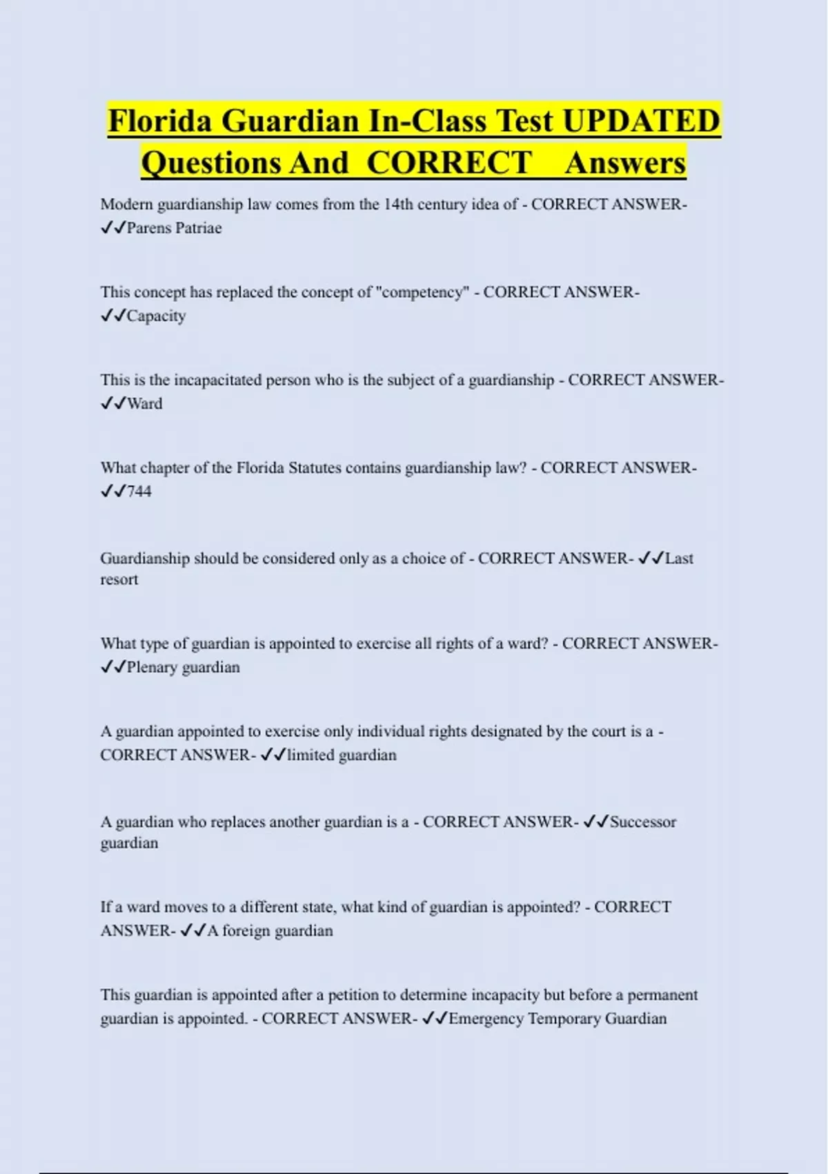 Florida Guardian In-Class Test UPDATED Questions And CORRECT Answers Modern guardianship law comes from the 14th century idea of - CORRECT ANSWER- Parens Patriae This concept has replaced the concept of "competency" - CORRECT ANSWER- Capacity This is the incapacitated person who is the subject of a guardianship - CORRECT ANSWER- Ward