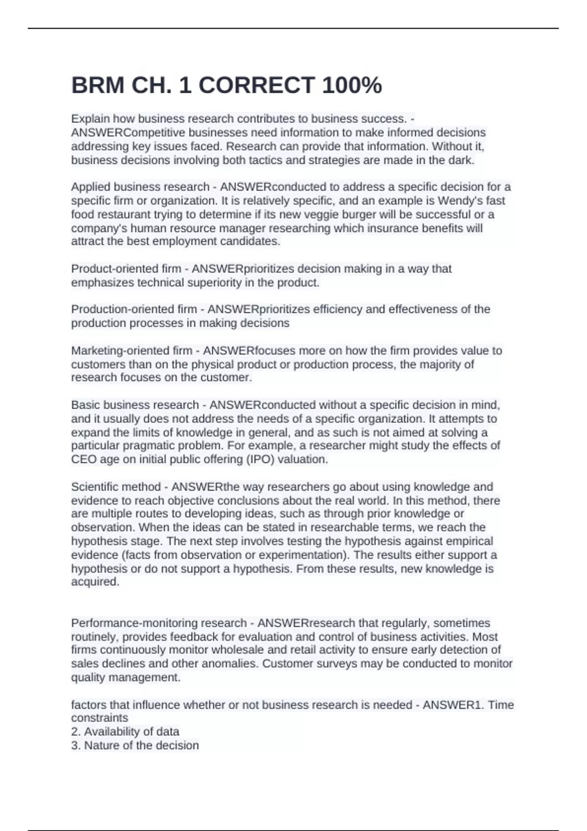 Explain how business research contributes to business success. - ANSWERCompetitive businesses need information to make informed decisions addressing key issues faced. Research can provide that information. Without it, business decisions involving both tactics and strategies are made in the dark. Applied business research - ANSWERconducted to address a specific decision for a specific firm or organization. It is relatively specific, and an example is Wendy's fast food restaurant trying to determine if its new veggie burger will be successful or a company's human resource manager researching which insurance benefits will attract the best employment candidates. Product-oriented firm - ANSWERprioritizes decision making in a way that emphasizes technical superiority in the product. Production-oriented firm - ANSWERprioritizes efficiency and effectiveness of the production processes in making decisions Marketing-oriented firm - ANSWERfocuses