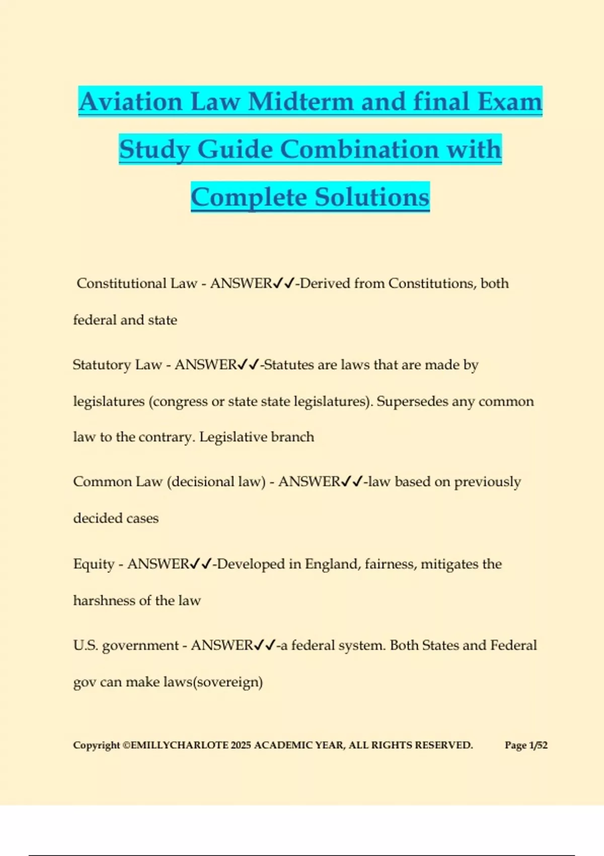 Aviation Law Midterm and final Exam Study Guide Combination with Complete Solutions Constitutional Law - ANSWER-Derived from Constitutions, both federal and state Statutory Law - ANSWER-Statutes are laws that are made by legislatures (congress or state state legislatures). Supersedes any common law to the contrary. Legislative branch Common Law (decisional law) - ANSWER-law based on previously decided cases Equity - ANSWER-Developed in England, fairness, mitigates the harshness of the law U.S. government - ANSWER-a federal system. Both States and Federal gov can make laws(sovereign) Copyright ©EMILLYCHARLOTE 2025 ACADEMIC YEAR, ALL RIGHTS RESERVED. Page 2/52 Federal vs. State - ANSWER-Some things are governed by Federal law alone, other by state law alone, sometimes by both (federal always supersedes state) Preemption of Laws - ANSWER-1). U.S. federal law 2). 50 State law 3). Municipality Law (County, parish, town, ect.) Types of Laws - ANSWER-Criminal Civil (tort and contract) Administrative Congress Clause - ANSWER-Congress used its authority under this of the U.S. constitution (Artcle1, Section8, Clause 3) to impose regulation on the aviation industry. Aviation involves interstate commerce, so Congress has the power to regulate it. Air Commerce act of 1926 was passed. Regulations - ANSWER-Federal regulation of aviation was placed under an "Aeronautics Branch" within the department of commerce. First Copyright ©EMILLYCHARLOTE 2025 ACADEMIC YEAR, ALL RIGHTS RESERVED. Page 3/52 regs went into effect Dec 31, 1926 Called " Air Commerce Regulations). Administrative agency under executive branch ACR - ANSWER-Required pilots and mechanics to be certificated, set standards for aircraft design and construction and engine type/design certification Bureau of Air Commerce - ANSWER-renamed from Aeronautics Branch, new act was passed called "Civil Aeronautics Act", then created "Civil Aeronautics Board (CAB)', and "Civil Aeronautics Administration (CAA)", Regulation reissued as "Civil Air Regulations(CAR)" civil aeronautics board - ANSWER-regulated economic aspects of aviation- fares charged and the routes flown by airlines. eliminated in 1985. Civil aeronautics administration - ANSWER-regulated all matters related to safety Federal Aviation Act - ANSWER-1958, created independent Federal agency called the FAA. Copyright ©EMILLYCHARLOTE 2025 ACADEMIC YEAR, ALL RIGHTS RESERVED. Page 4/52 Federal Aviation Regulation - ANSWER-FAR, Extensive rewrite of regulations, Found in the code of federal regulation (CFR). Contains regulations from other agencies like OSHA, FCC, EPA etc. CFR - ANSWER-organized into titles, FAR's found in Title 14. Far's are divided into parts which deal with different topics.