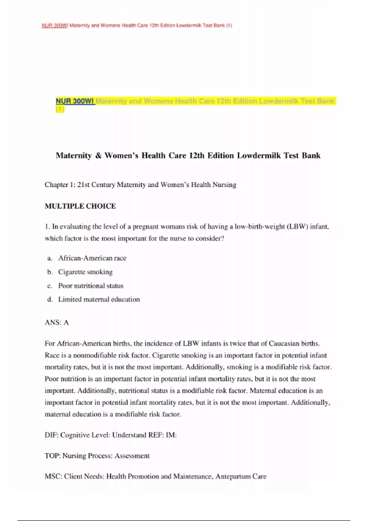 Test Bank For Maternity and Womens Health Care 12th Edition (Lowdermilk 2023/2024)| All Chapters| Complete Questions and Answers A+. Table of Contents 1. 21st Century Maternity and Women’s Health Nursing 2. Community Care: The Family and Culture 3. Nursing and Genomics 4. Assessment and Health Promotion 5. Violence Against Women 6. Reproductive System Concerns 7. Sexually Transmitted and Other Infections 8. Contraception and Abortion 9. Infertility 10. Problems of the Breast 11. Structural Disorders and Neoplasms of the Reproductive System 12. Conception and Fetal Development 13. Anatomy and Physiology of Pregnancy 14. Nursing Care of the Family During Pregnancy 15. Maternal and Fetal Nutrition 16. Labor and Birth Processes 17. Maximizing Comfort For The Laboring Woman 18. Fetal Assessment During Labor 19. Nursing Care of the Family During Labor and Birth 20. Postpartum Physiologic Changes 21. Nursing Care of the Family During the Postpartum Period 22. Transition to Parenthood 23. Physiologic and Behavioral Adaptations of the Newborn 24. Nursing Care of the Newborn and Family 25. Newborn Nutrition and Feeding 26. Assessment of High Risk Pregnancy 27. Hypertensive Disorders 28. Hemorrhagic Disorders 29. Endocrine and Metabolic Disorders 30. Medical-Surgical Disorders 31. Mental Health Disorders and Substance Abuse 32. Labor and Birth Complications 33. Postpartum Complications 34. Nursing Care of the High-Risk Newborn 35. Acquired Problems of the Newborn 36. Hemolytic Disorders and Congenital Anomalies 37. Perinatal Loss, Bereavement, and Grief Maternity & Women’s Health Care 12th Edition Lowdermilk Test Bank Chapter 1: 21st Century Maternity and Women’s Health Nursing MULTIPLE CHOICE 1. In evaluating the level of a pregnant womans risk of having a low-birth-weight (LBW) infant, which factor is the most important for the nurse to consider? a. African-American race b. Cigarette smoking c. Poor nutritional status d. Limited maternal education ANS: A For African-American births, the incidence of LBW infants is twice that of Caucasian births. Race is a nonmodifiable risk factor. Cigarette smoking is an important factor in potential infant mortality rates, but it is not the most important. Additionally, smoking is a modifiable risk factor. Poor nutrition is an important factor in potential infant mortality rates, but it is not the most important. Additionally, nutritional status is a modifiable risk factor. Maternal education is an important factor in potential infant mortality rates, but it is not the most important. Additionally, maternal education is a modifiable risk factor. DIF: Cognitive Level: Understand REF: IM: TOP: Nursing Process: Assessment MSC: Client Needs: Health Promotion and Maintenance, Antepartum Care 2. What is the primary role of practicing nurses in the research process? a. Designing research studies b. Collecting data for other researchers c. Identifying researchable problems d. Seeking funding to support research studies ANS: C When problems are identified, research can be properly conducted. Research of health care issues leads to evidence-based practice guidelines. Designing research studies is only one factor of the research process. Data collection is another factor of research. Financial support is necessary to conduct research, but it is not the primary role of the nurse in the research process. DIF: Cognitive Level: Understand REF: im: 14 TOP: Nursing Process: N/A MSC: Client Needs: Safe and Effective Care Environment 3. A 23-year-old African-American woman is pregnant with her first child. Based on the statistics for infant mortality, which plan is most important for the nurse to implement? a. Perform a nutrition assessment. b. Refer the woman to a social worker. c. Advise the woman to see an obstetrician, not a midwife. d. Explain to the woman the importance of keeping her prenatal care appointments. ANS: D Consistent prenatal care is the best method of preventing or controlling risk factors associated with infant mortality. Nutritional status is an important modifiable risk factor, but it is not the most important action a nurse should take in this situation. The client may need assistance from a social worker at some time during her pregnancy, but a referral to a social worker is not the most important aspect the nurse should address at this time. If the woman has identifiable high-risk problems, then her health care may need to be provided by a physician. However, it cannot be assumed that all African-American women have high-risk issues. In addition, advising the woman to see an obstetrician is not the most important aspect on which the nurse should focus at this time, and it is not appropriate for a nurse to advise or manage the type of care a client is to receive. DIF: Cognitive Level: Understand REF: IM: TOP: Nursing Process: Planning MSC: Client Needs: Health Promotion and Maintenance 4. During a prenatal intake interview, the nurse is in the process of obtaining an initial assessment of a 21-year-old Hispanic client with limited English proficiency. Which action is the most important for the nurse to perform? a. Use maternity jargon to enable the client to become familiar with these terms. b. Speak quickly and efficiently to expedite the visit. c. Provide the client with handouts. d. Assess whether the client understands the discussion. ANS: D Nurses contribute to health literacy by using simple, common words, avoiding jargon, and evaluating whether the client understands the discussion. Speaking slowly and clearly and focusing on what is important will increase understanding. Most client education materials are written at a level too high for the average adult and may not be useful for a client with limited English proficiency. DIF: Cognitive Level: Apply REF: im: 5 TOP: Nursing Process: Evaluation MSC: Client Needs: Health Promotion and Maintenance 5. The nurses working at a newly established birthing center have begun to compare their performan
