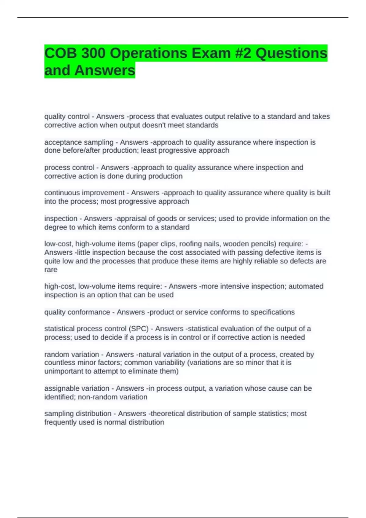 COB 300 Operations Exam #2 Questions