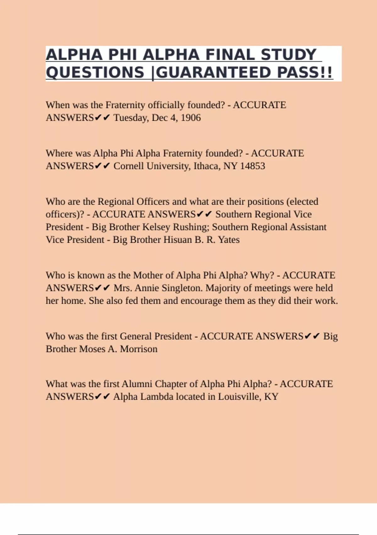 ACCURATE ANSWERS✔✔ The History of Alpha Phi Alpha: A