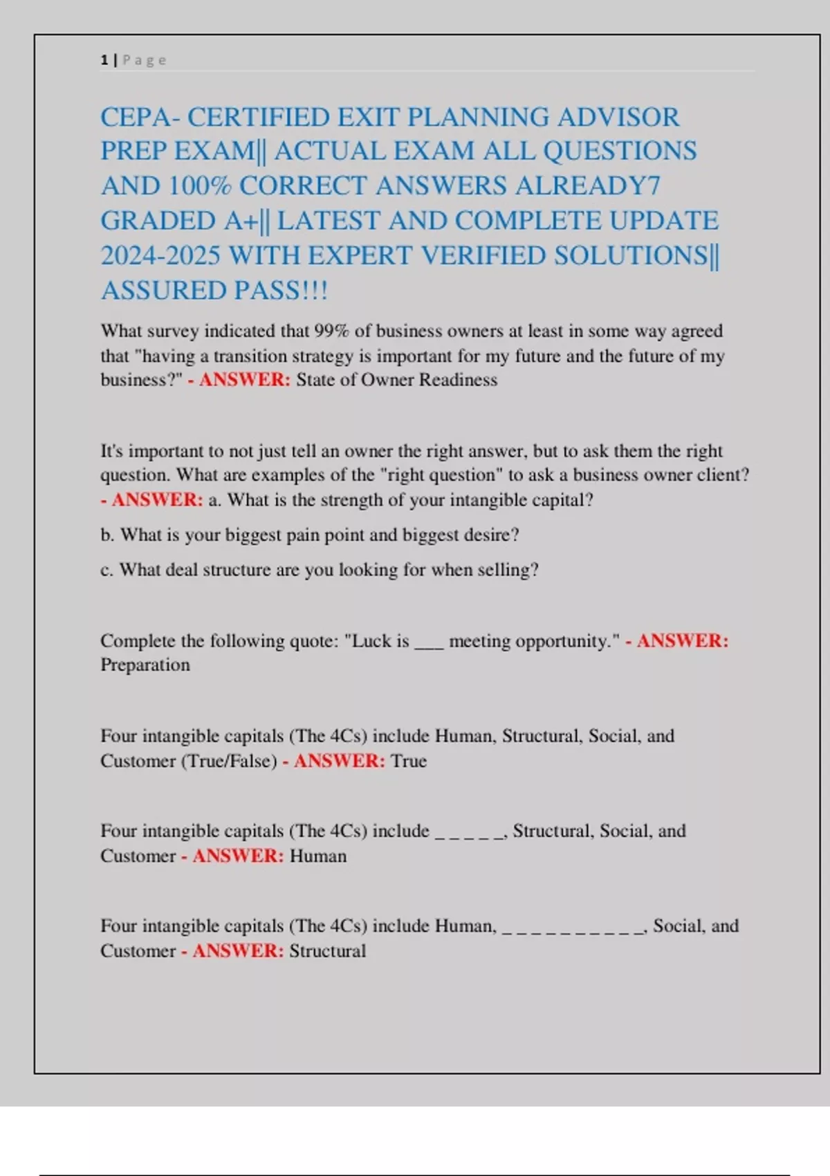 CEPA- CERTIFIED EXIT PLANNING ADVISOR PREP EXAM|| ACTUAL EXAM ALL QUESTIONS AND 100% CORRECT ANSWERS ALREADY7 GRADED A+|| LATEST AND COMPLETE UPDATE WITH EXPERT VERIFIED SOLUTIONS|| ASSURED PASS!!!