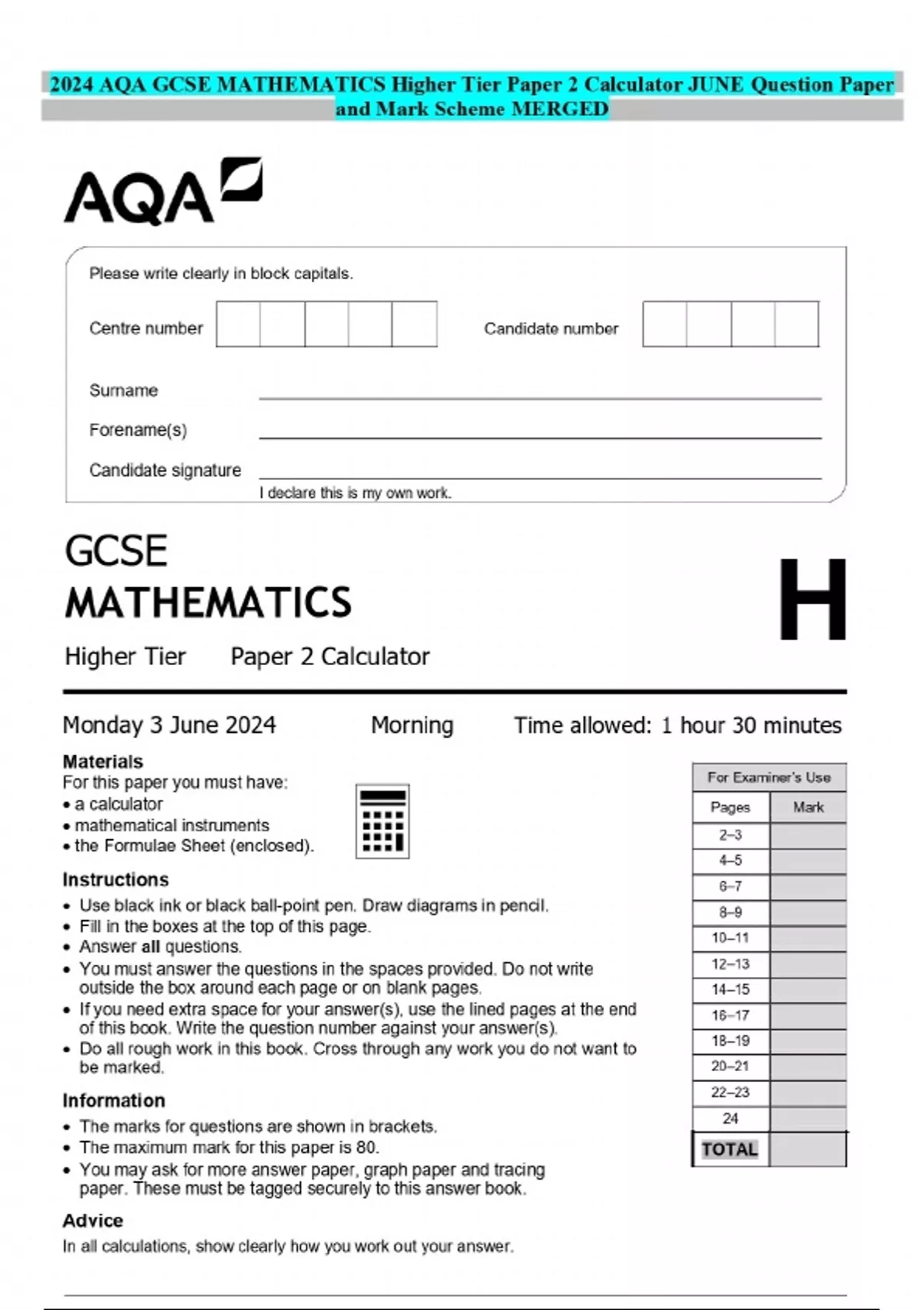 2024 AQA GCSE MATHEMATICS Higher Tier Paper 2 Calculator JUNE Question Paper and Mark Scheme MERGED