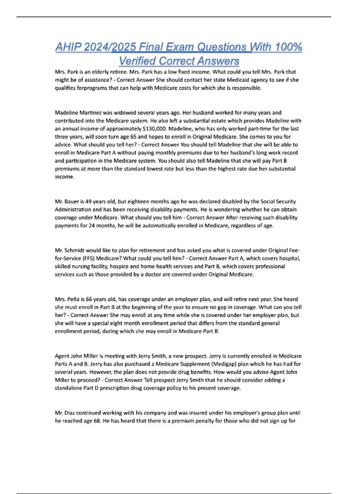 AHIP 2024/2025 Final Exam Questions With 100% Verified Correct Answers Mrs. Park is an elderly retiree. Mrs. Park has a low fixed income. What could you tell Mrs. Park that might be of assistance? - Correct Answer She should contact her state Medicaid agency to see if she qualifies forprograms that can help with Medicare costs for which she is responsible. Madeline Martinez was widowed several years ago. Her husband worked for many years and contributed into the Medicare system. He also left a substantial estate which provides Madeline with an annual income of approximately $130,000. Madeline, who has only worked part-time for the last three years, will soon turn age 65 and hopes to enroll in Original Medicare. She comes to you for advice. What should you tell her? - Correct Answer You should tell Madeline that she will be able to enroll in Medicare Part A without paying monthly premiums due to her husband's long work record and participation in the Medicare system. You should also tell Madeline that she will pay Part B premiums at more than the standard lowest rate but less than the highest rate due her substantial income. Mr. Bauer is 49 years old, but eighteen months ago he was declared disabled by the Social Security Administration and has been receiving disability payments. He is wondering whether he can obtain coverage under Medicare. What should you tell him - Correct Answer After receiving such disability payments for 24 months, he will be automatically enrolled in Medicare, regardless of age. Mr. Schmidt would like to plan for retirement and has asked you what is covered under Original Fee-for-Service (FFS) Medicare? What could you tell him? - Correct Answer Part A, which covers hospital, skilled nursing facility, hospice and home health services and Part B, which covers professional services such as those provided by a doctor are covered under Original Medicare. Mrs. Peňa is 66 years old, has coverage under an employer plan, and will retire next year. She heard she must enroll in Part B at the beginning of the year to ensure no gap in coverage. What can you tell her? - Correct Answer She may enroll at any time while she is covered under her employer plan, but she will have a special eight month enrollment period that differs from the standard general enrollment period, during which she may enroll in Medicare Part B. Agent John Miller is meeting with Jerry Smith, a new prospect. Jerry is currently enrolled in Medicare Parts A and B. Jerry has also purchased a Medicare Supplement (Medigap) plan which he has had for several years. However, the plan does not provide drug benefits. How would you advise Agent John Miller to proceed? - Correct Answer Tell prospect Jerry Smith that he should consider adding a standalone Part D prescription drug coverage policy to his present coverage. Mr. Diaz continued working with his company and was insured under his employer's group plan until he reached age 68. He has heard that there is a premium penalty for those who did not sign up for