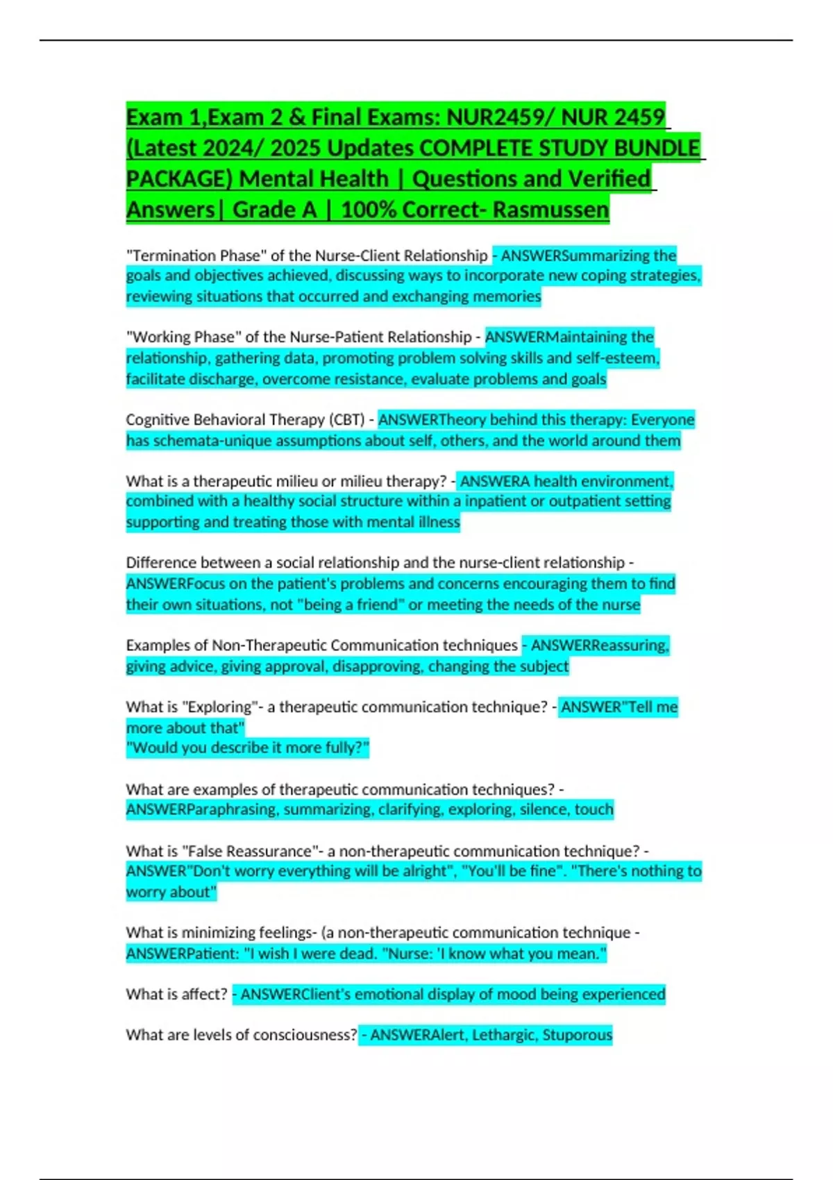 Exam 1,Exam 2 & Final Exams: NUR2459/ NUR 2459 (Latest 2024/ 2025 Updates COMPLETE STUDY BUNDLE PACKAGE) Mental Health | Questions and Verified Answers| Grade A | 100% Correct- Rasmussen