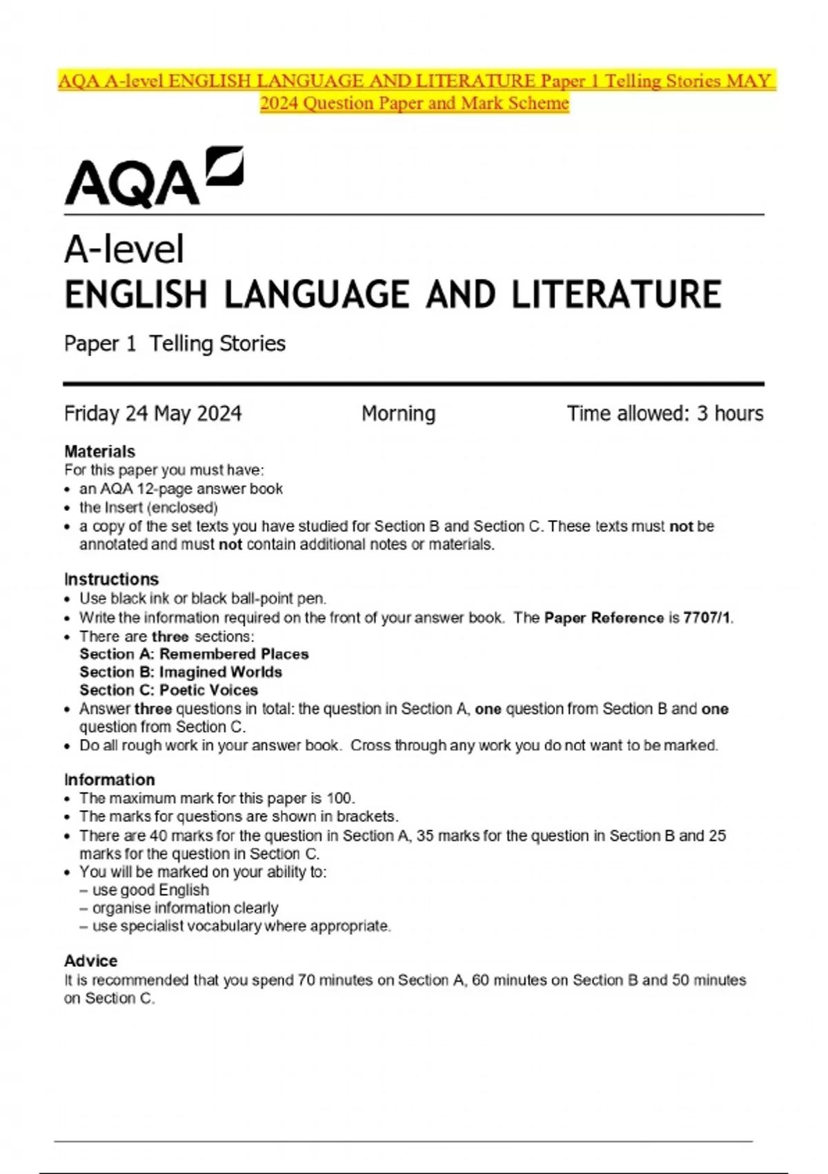 AQA A-level ENGLISH LANGUAGE AND LITERATURE Paper 1 Telling Stories MAY 2024 Question Paper and Mark Scheme