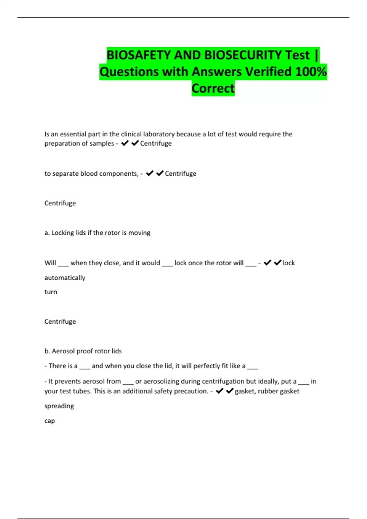BIOSAFETY AND BIOSECURITY Test | Questions with Answers Verified 100% Correct