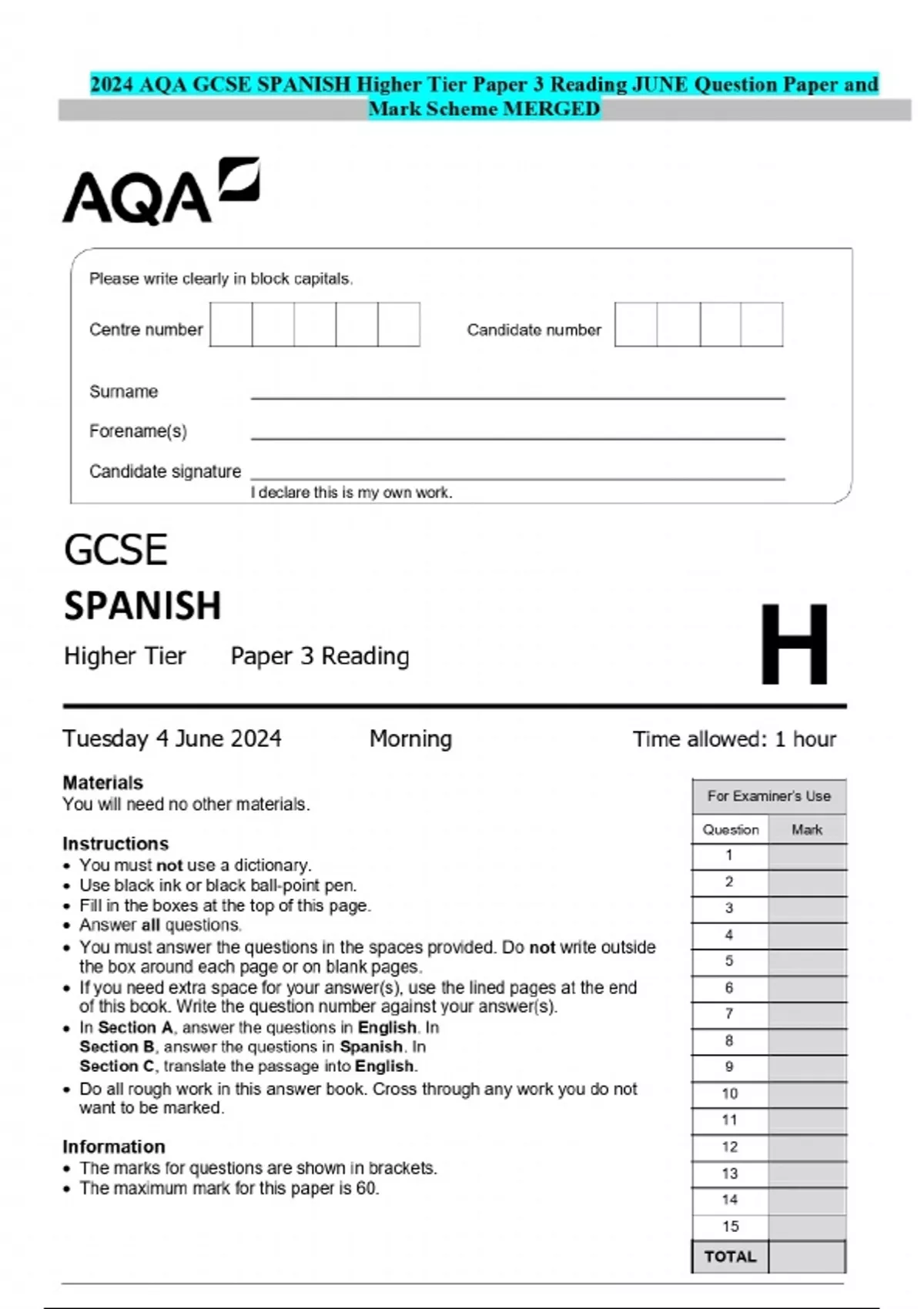 2024 AQA GCSE SPANISH Higher Tier Paper 3 Reading JUNE Question Paper and Mark Scheme MERGED