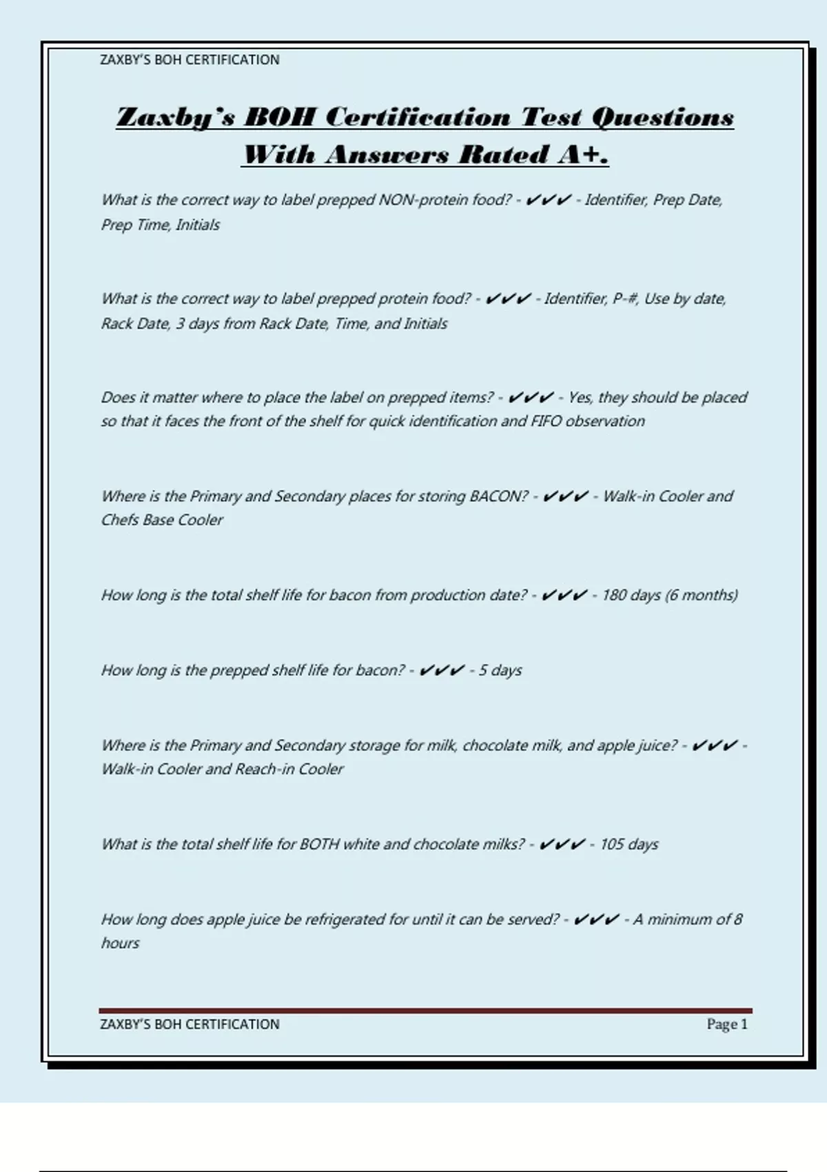 Zaxby’s BOH Certification Test Questions With Answers Rated A+.
