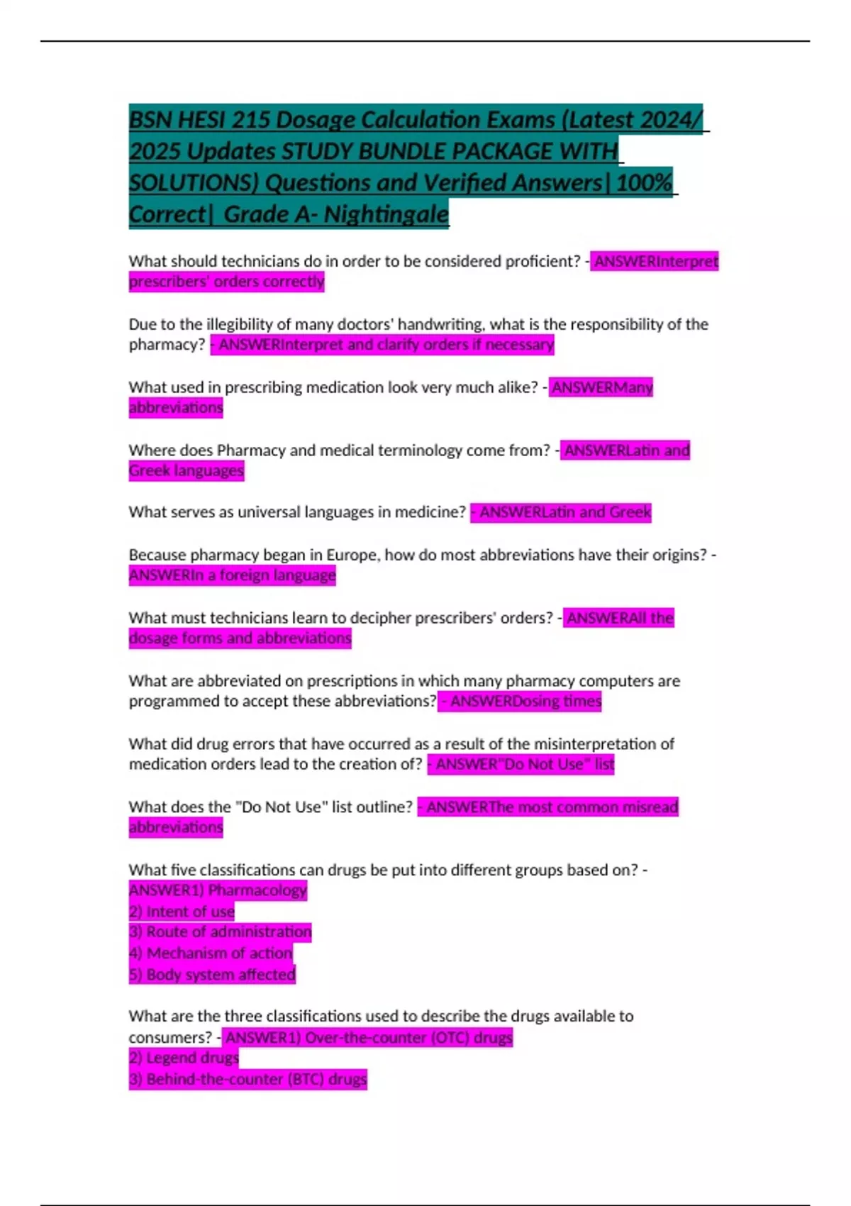 BSN HESI 215 Dosage Calculation Exams (Latest 2024/