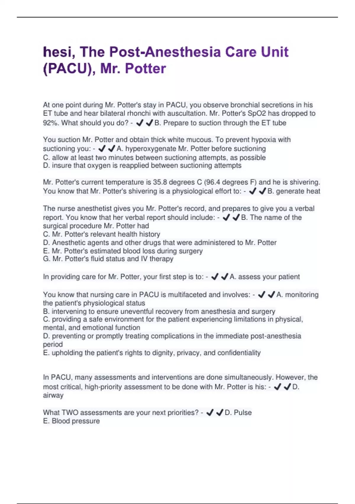 You suction Mr. Potter and obtain thick white mucous. To prevent hypoxia with
