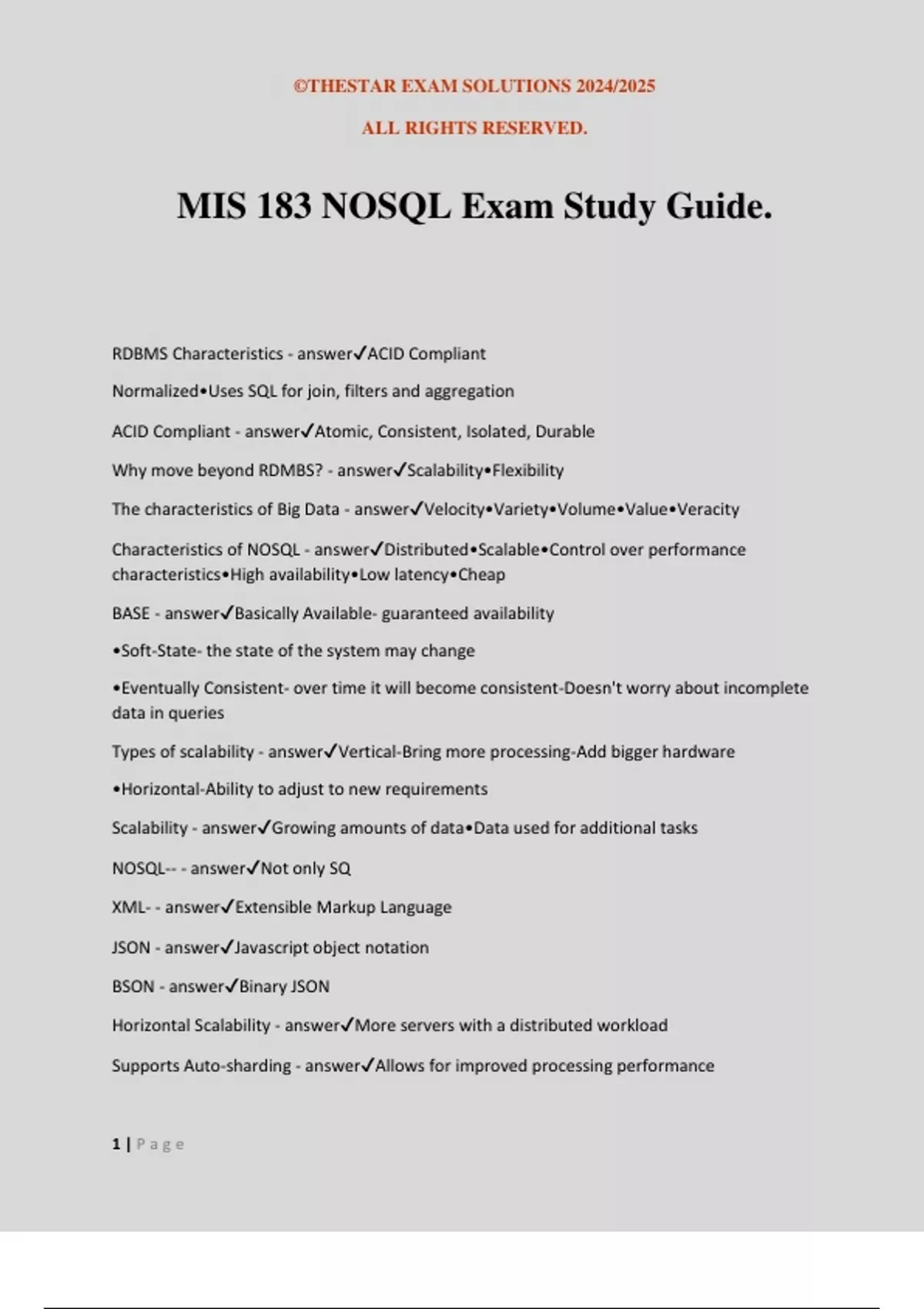 ©THESTAR EXAM SOLUTIONS 2024/2025 ALL RIGHTS RESERVED. 1 | P a g e MIS 183 NOSQL Exam Study Guide. RDBMS Characteristics - answerACID Compliant Normalized•Uses SQL for join, filters and aggregation ACID Compliant - answerAtomic, Consistent, Isolated, Durable Why move beyond RDMBS? - answerScalability•Flexibility The characteristics of Big Data - answerVelocity•Variety•Volume•Value•Veracity Characteristics of NOSQL - answerDistributed•Scalable•Control over performance characteristics•High availability•Low latency•Cheap BASE - answerBasically Available- guaranteed availability