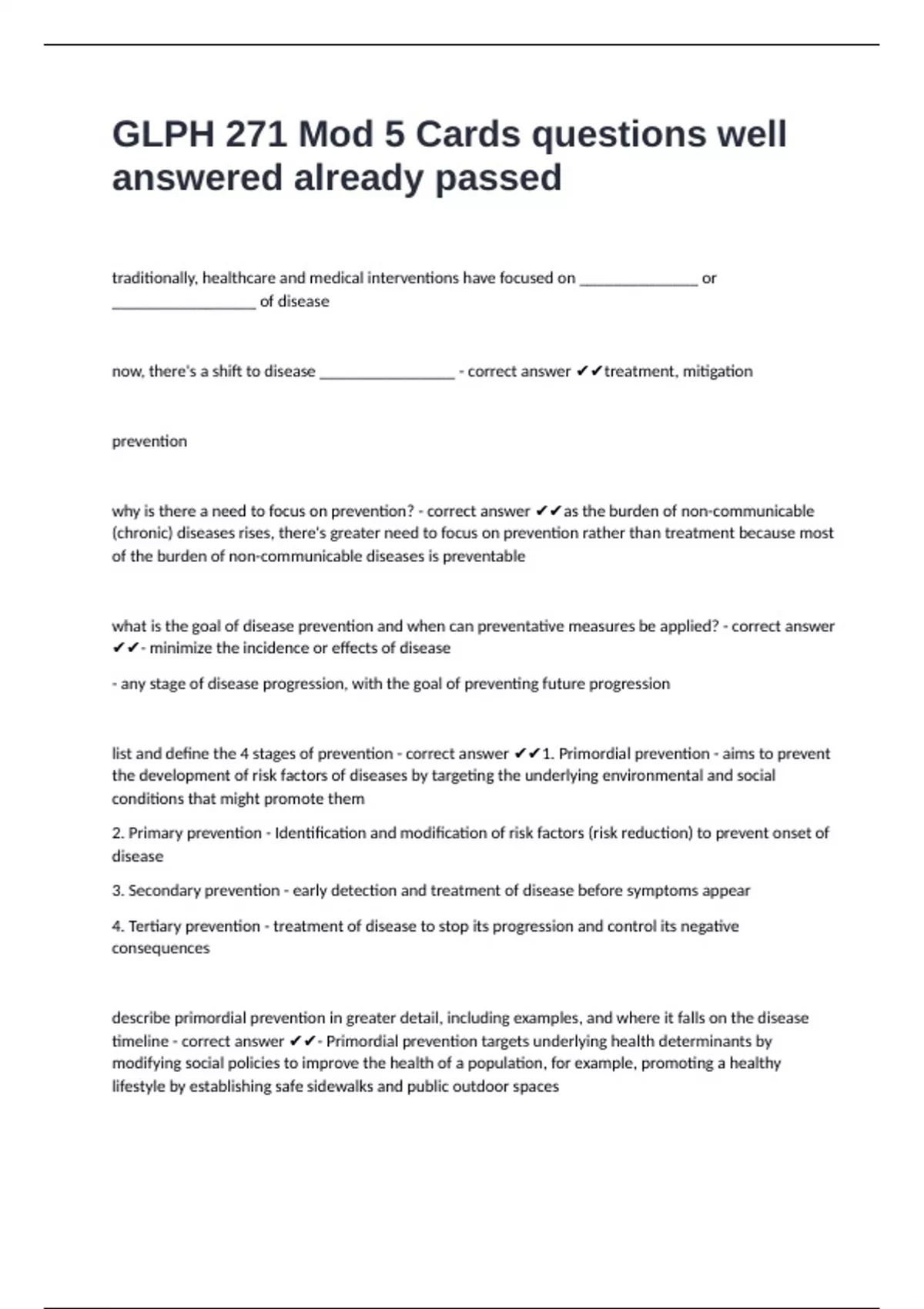 list and define the 4 stages of prevention - correct answer ✔✔1. Primordial prevention - aims to prevent