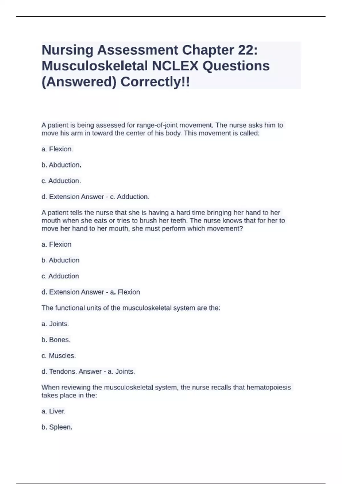 Nursing Assessment Chapter 22 - Musculoskeletal NCLEX Questions (Answered) Correctly