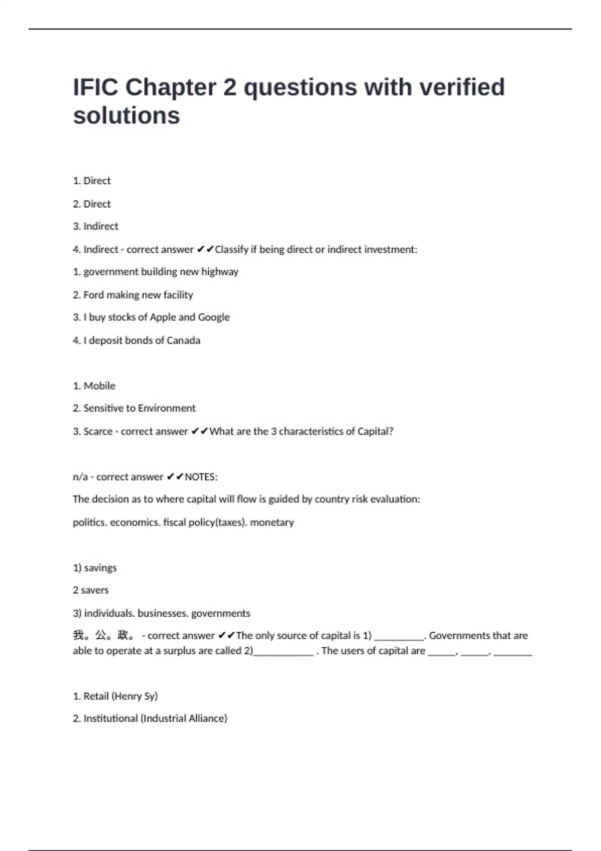 4. Indirect - correct answer ✔✔Classify if being direct or indirect investment: