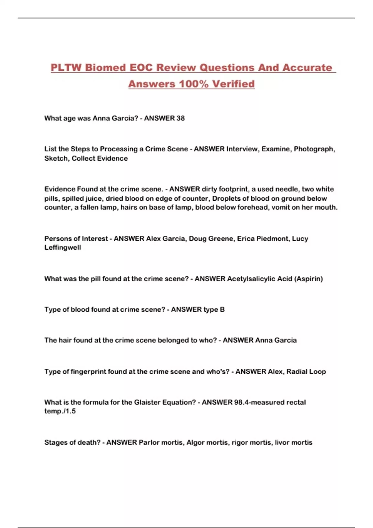 PLTW Biomed EOC Review Questions And Accurate Answers 100% Verified