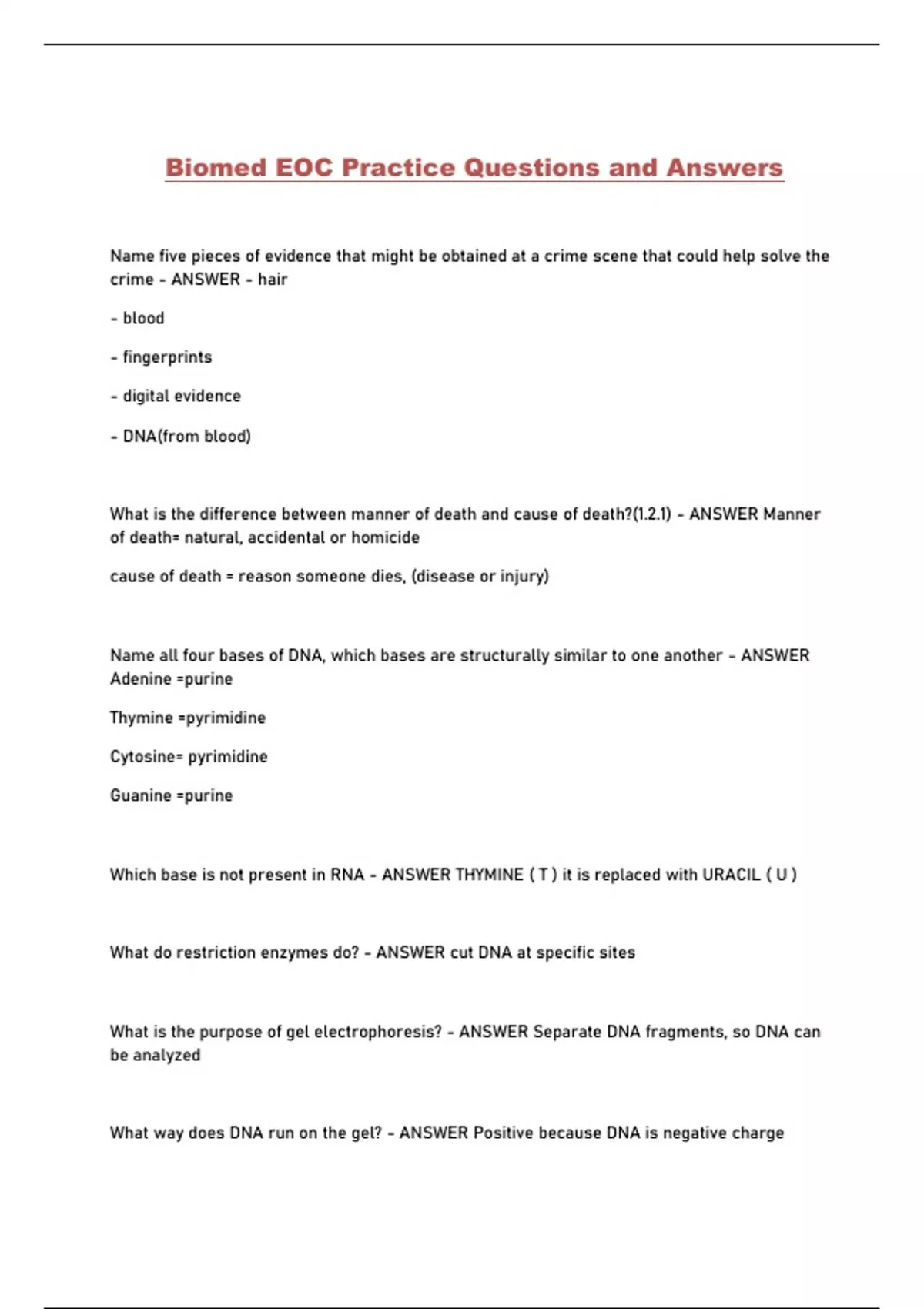 What is the purpose of gel electrophoresis? - ANSWER Separate DNA fragments, so DNA can