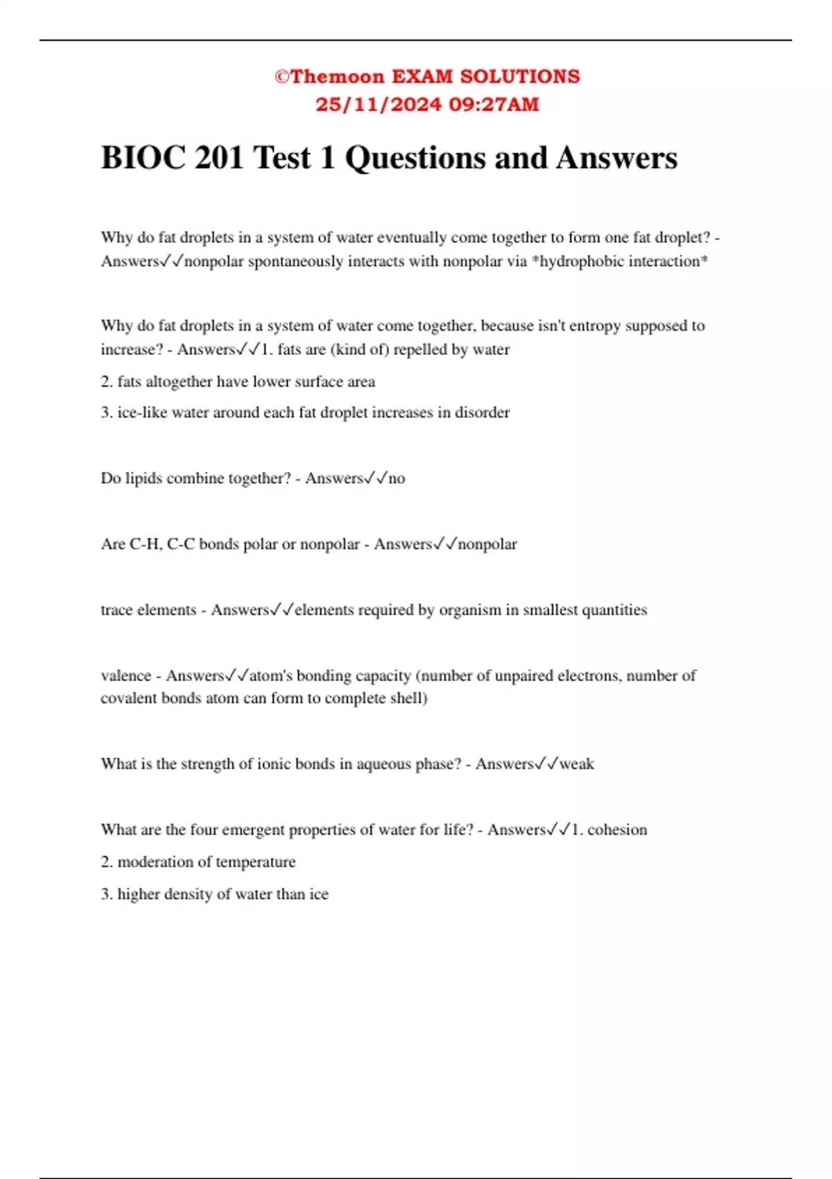 BIOC 201 Test 1 Questions and Answers Why do fat droplets in a system of water eventually come together to form one fat droplet? - Answersnonpolar spontaneously interacts with nonpolar via *hydrophobic interaction* Why do fat droplets in a system of water come together, because isn't entropy supposed to increase? - Answers1. fats are (kind of) repelled by water 2. fats altogether have lower surface area 3. ice-like water around each fat droplet increases in disorder Do lipids combine together? - Answersno Are C-H, C-C bonds polar or nonpolar - Answersnonpolar trace elements - Answerselements required by organism in smallest quantities valence - Answersatom's bonding capacity (number of unpaired electrons, number of covalent bonds atom can form to complete shell) What is the strength of ionic bonds in aqueous phase? - Answersweak What are the four emergent properties of water for life? - Answers1. cohesion 2. moderation of temperature 3. higher density of water than ice