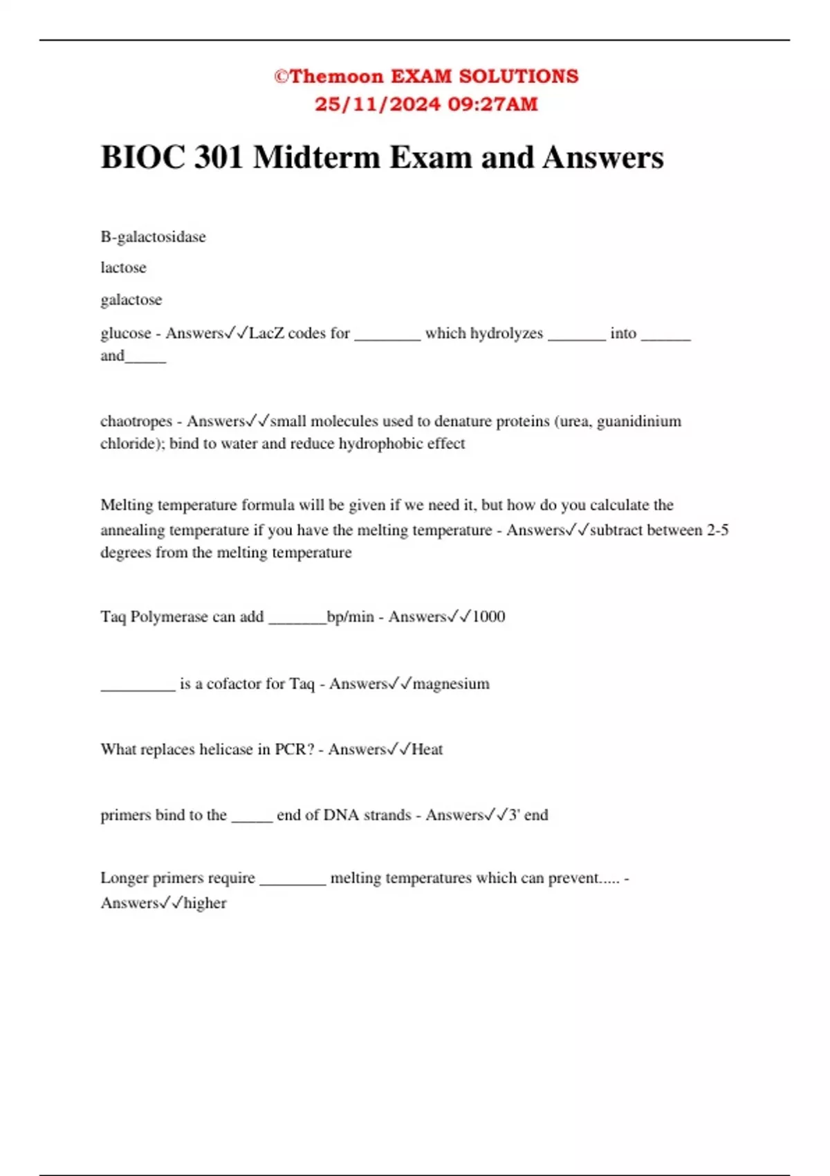 BIOC 301 Midterm Exam and Answers B-galactosidase lactose galactose glucose - AnswersLacZ codes for ________ which hydrolyzes _______ into ______ and_____ chaotropes - Answerssmall molecules used to denature proteins (urea, guanidinium chloride); bind to water and reduce hydrophobic effect Melting temperature formula will be given if we need it, but how do you calculate the annealing temperature if you have the melting temperature - Answerssubtract between 2-5 degrees from the melting temperature Taq Polymerase can add _______bp/min - Answers1000 _________ is a cofactor for Taq - Answersmagnesium What replaces helicase in PCR? - AnswersHeat primers bind to the _____ end of DNA strands - Answers3' end Longer primers require ________ melting temperatures which can prevent..... - Answershigher