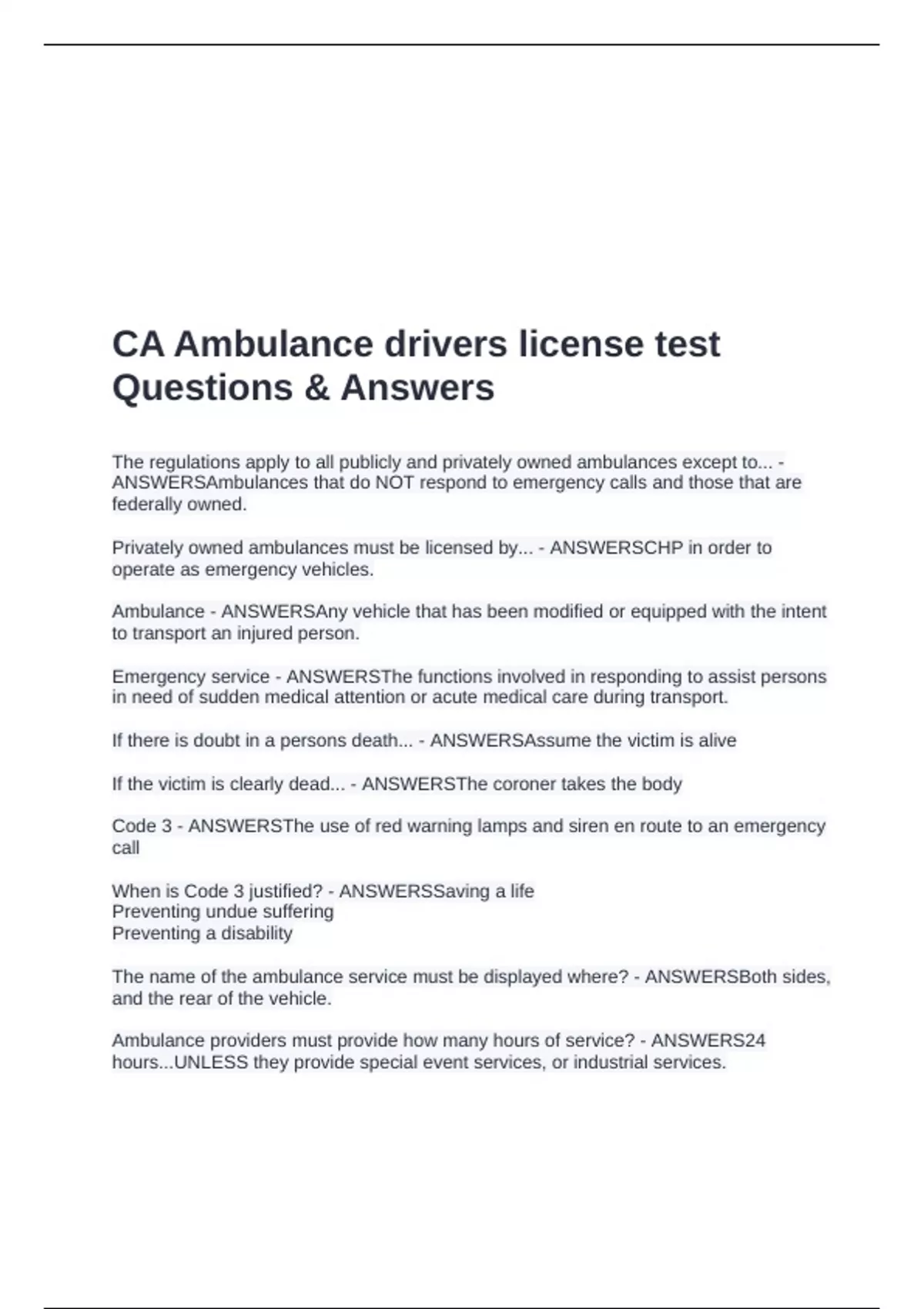 CA Ambulance drivers license test Questions & Answers