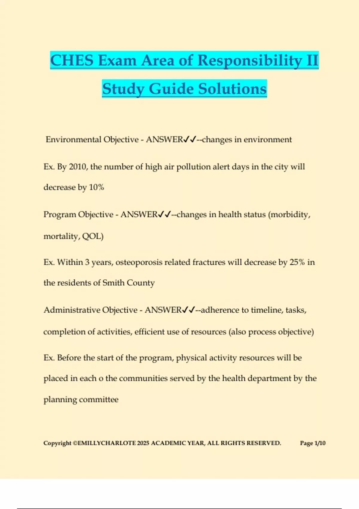 CHES Exam Area of Responsibility II Study Guide Solutions Environmental Objective - ANSWER--changes in environment Ex. By 2010, the number of high air pollution alert days in the city will decrease by 10% Program Objective - ANSWER--changes in health status (morbidity, mortality, QOL) Ex. Within 3 years, osteoporosis related fractures will decrease by 25% in the residents of Smith County Administrative Objective - ANSWER--adherence to timeline, tasks, completion of activities, efficient use of resources (also process objective) Ex. Before the start of the program, physical activity resources will be placed in each o the communities served by the health department by the planning committee Copyright ©EMILLYCHARLOTE 2025 ACADEMIC YEAR, ALL RIGHTS RESERVED. Page 2/10 Learning Objective - ANSWER--changes in knowledge, attitude, practices etc (also impact objective) Ex The participants will be able to correctly identify 3 forms of weight- bearing activities after the first session Behavioral Objective - ANSWER--changes in behavior, behavior adaptation (also impact objective) Ex. Among those attending the program, weight-bearing activity will increase by 50% over the following 6 months CDCynergy (6 Steps) - ANSWER-1) Define & describe the problem 2) Analyze the problem 3) Identify & profile the audience 4) Develop communication strategies 5) Develop evaluation plan & 6) Launch the program & obtain feedback Copyright ©EMILLYCHARLOTE 2025 ACADEMIC YEAR, ALL RIGHTS RESERVED. Page 3/10 Health Communication - ANSWER--an attempt to share information with influence, and support a variety of audiences to engage in healthy behaviors or support health related activities Health Communication Model - ANSWER-1) Planning & strategy development 2) Developing and pretesting concepts, messages & materials 3) Implementing the program 4) Assessing effectiveness & making refinemen