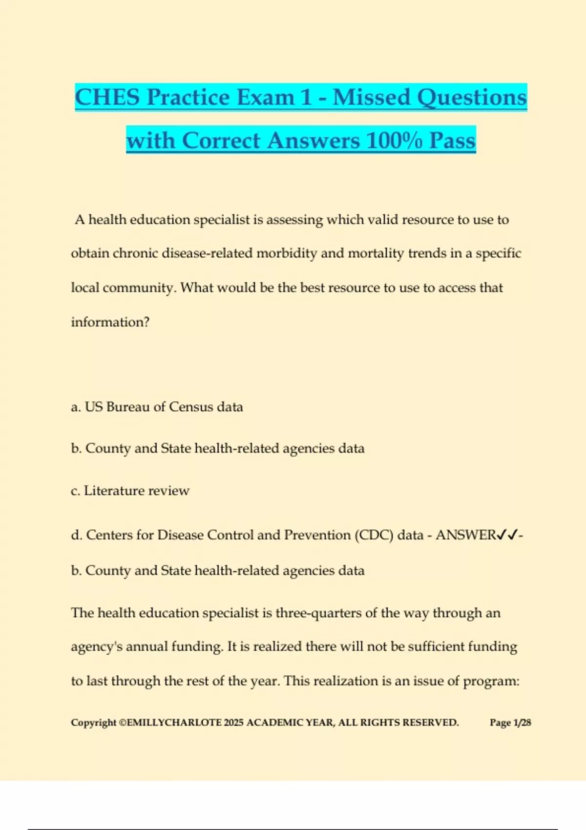 CHES Practice Exam 1 - Missed Questions with Correct Answers 100% Pass A health education specialist is assessing which valid resource to use to obtain chronic disease-related morbidity and mortality trends in a specific local community. What would be the best resource to use to access that information? a. US Bureau of Census data b. County and State health-related agencies data c. Literature review d. Centers for Disease Control and Prevention (CDC) data - ANSWER- b. County and State health-related agencies data The health education specialist is three-quarters of the way through an agency's annual funding. It is realized there will not be sufficient funding to last through the rest of the year. This realization is an issue of program: Copyright ©EMILLYCHARLOTE 2025 ACADEMIC YEAR, ALL RIGHTS RESERVED. Page 2/28 a. sustainability. b. longevity. c. evaluation. d. planning. - ANSWER-a. sustainability. The coalition is having a difficult time persuading a decision-maker to support an issue. The decision-maker, however, can be swayed by level of public support for the issue. The most important data collection method to use next, therefore, would be: a. political capital charting. b. communications capacity analysis. c. community leader surveys. d. voting record examination. - ANSWER-c. community leader surveys. What is an effective way to identify stakeholders? Copyright ©EMILLYCHARLOTE 2025 ACADEMIC YEAR, ALL RIGHTS RESERVED. Page 3/28 a. Contact people in the target community to gather categories and names. b. Use people whom are known and have worked on other projects. c. Gather people in professional organizations who have worked in the general region. d. Work primarily with political organizations that work with segments of the community. - ANSWER-a. Contact people in the target community to gather categories and names. Using an ecological approach, the health education specialist identifies an organizational-level local business to be a member of a preventive mental health coalition. That business was selected because hiring personnel employ military veterans, many of whom suffered from Post-Traumatic Stress Disorder (PTSD). The role that local business plays on the coalition is that of a: a. partner. c. influencer. b. priority population. Copyright ©EMILLYCHARLOTE 2025 ACADEMIC YEAR, ALL RIGHTS RESERVED. Page 4/28 d. stakeholder. - ANSWER-b. priority population. In the informational training related to an adolescent health literacy pilot program, the attendees, all of whom are classroom teachers, state that instead of having a single facilitator come into their classroom to deliver the curriculum, they prefer to deliver it themselves. They make their case to the trainer, stating they are classroom teachers and, as such, know how to deliver curriculum. Which of the following concepts does the trainer use to explain why this health education curriculum is being implem