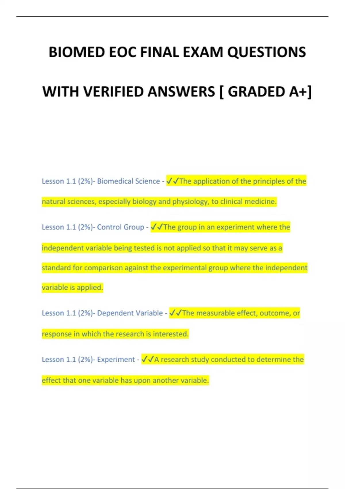 BIOMED EOC FINAL EXAM QUESTIONS WITH VERIFIED ANSWERS [ GRADED A+] Lesson 1.1 (2%)- Biomedical Science - The application of the principles of the natural sciences, especially biology and physiology, to clinical medicine. Lesson 1.1 (2%)- Control Group - The group in an experiment where the independent variable being tested is not applied so that it may serve as a standard for comparison against the experimental group where the independent variable is applied. Lesson 1.1 (2%)- Dependent Variable - The measurable effect, outcome, or response in which the research is interested. Lesson 1.1 (2%)- Experiment - A research study conducted to determine the effect that one variable has upon another variable.