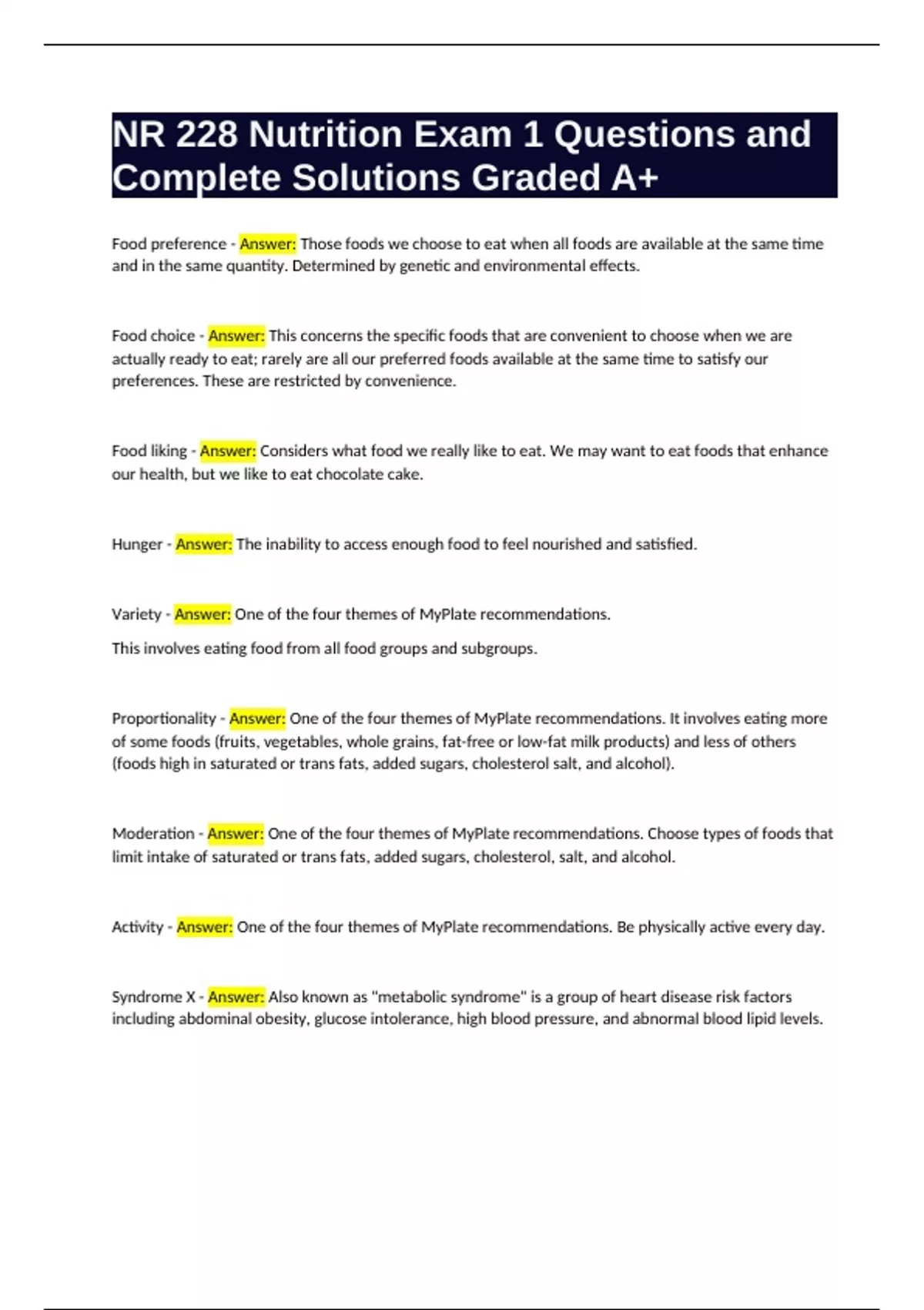 NR 228 Nutrition Exam 1 Questions and Complete Solutions Graded A+