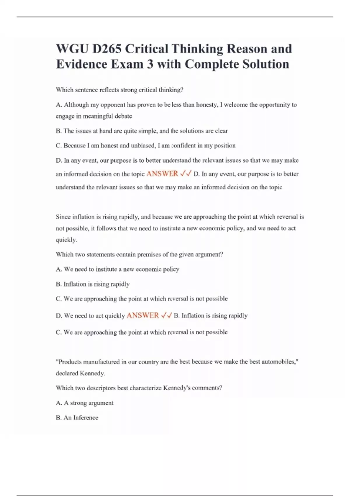 WGU D265 Critical Thinking Reason and Evidence Exam 3 with Complete Solution