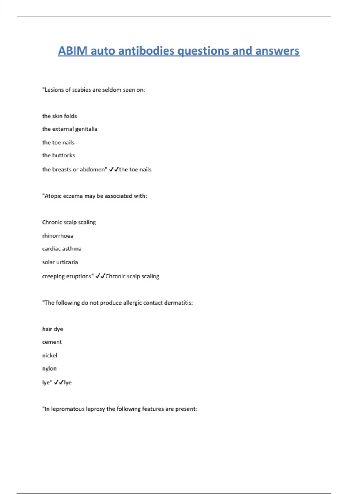 ABIM auto antibodies questions and answers "Lesions of scabies are seldom seen on: the skin folds the external genitalia the toe nails the buttocks the breasts or abdomen" the toe nails "Atopic eczema may be associated with: