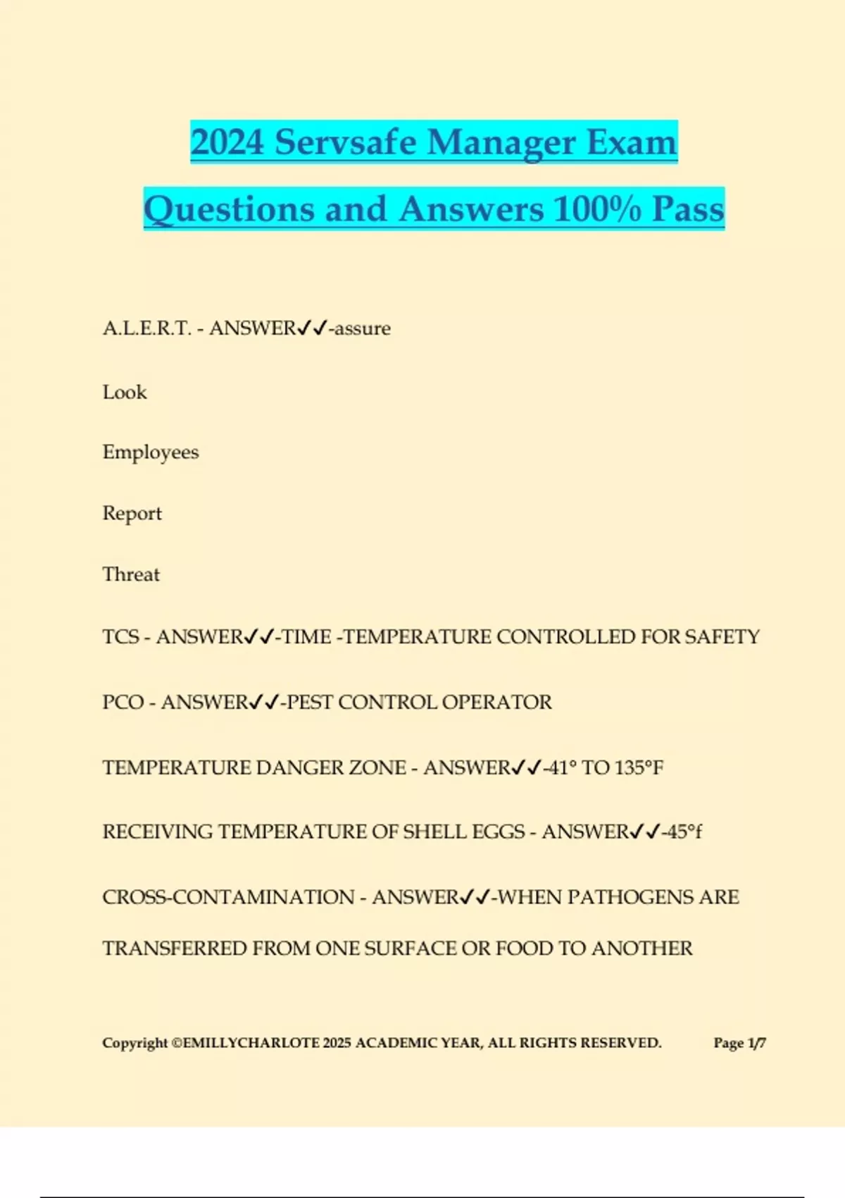 2024 Servsafe Manager Exam Questions and Answers 100% Pass A.L.E.R.T. - ANSWER-assure Look Employees Report Threat TCS - ANSWER-TIME -TEMPERATURE CONTROLLED FOR SAFETY PCO - ANSWER-PEST CONTROL OPERATOR TEMPERATURE DANGER ZONE - ANSWER-41° TO 135°F RECEIVING TEMPERATURE OF SHELL EGGS - ANSWER-45°f CROSS-CONTAMINATION - ANSWER-WHEN PATHOGENS ARE TRANSFERRED FROM ONE SURFACE OR FOOD TO ANOTHER Copyright ©EMILLYCHARLOTE 2025 ACADEMIC YEAR, ALL RIGHTS RESERVED. Page 2/7 READY-TO-EAT FOODS - ANSWER-FOODS THAT CAN BE EATEN WITH NO FURTHER PREPARATION, COOKING OR WASHING HIGH RISK POPULATION - ANSWER-ELDERLY PRESCHOOL AGE CHILDREN PEOPLE WITH COMPROMISED IMMUNE SYSTEMS US.D.A. - ANSWER-UNITED STATES DEPARTMENT OF AGRICULTURE CDC - ANSWER-CENTER FOR DISEASE CONTROL PATHOGENS - ANSWER-HARMFUL MICCROORGANISMS FAT TOM ( CONDITIONS FOR BACTERIA TO GROW) - ANSWER- FOOD ACIDITY Copyright ©EMILLYCHARLOTE 2025 ACADEMIC YEAR, ALL RIGHTS RESERVED. Page 3/7 TEMPERATURE TIME OXYGEN MOISTURE COMMON FOOD ALLERGENS - ANSWER-MILK EGGS FISH PEANUTS Copyright ©EMILLYCHARLOTE 2025 ACADEMIC YEAR, ALL RIGHTS RESERVED. Page 4/7 SHELLFISH TREE NUTS SOY WHEAT CROSS-CONTACT - ANSWER-TRANSFERRING AN ALLERGEN FROM FOOD OR FOOD CONTACT SURFACES TO THE FOOD SERVED TO THE CUSTOMER SAFE COOKING TEMP FOR GROUND BEEF - ANSWER-155°F RECEIVING TEMP FOR SHELL EGGS - ANSWER-45°