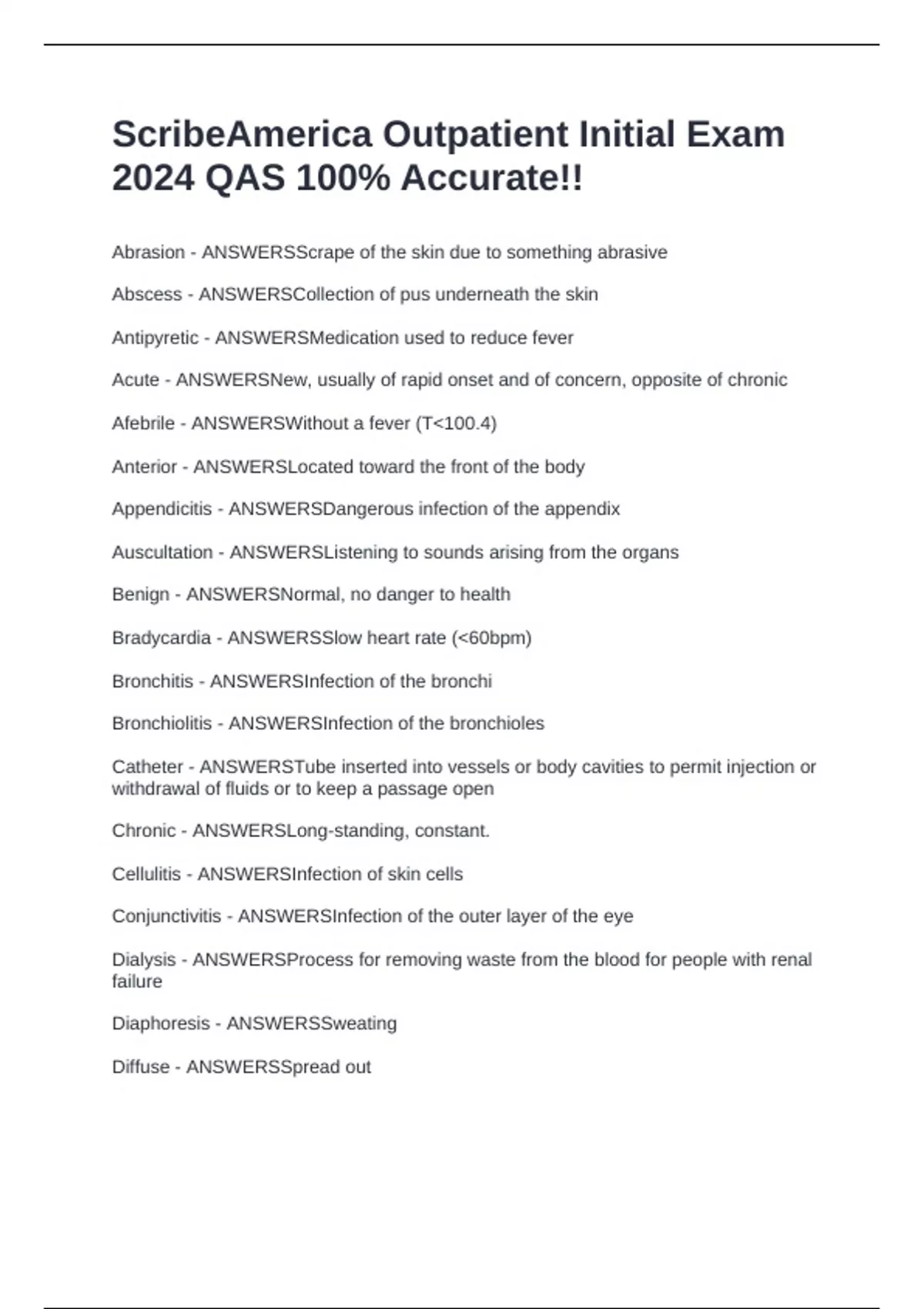 Abrasion - ANSWERSScrape of the skin due to something abrasive Abscess - ANSWERSCollection of pus underneath the skin Antipyretic - ANSWERSMedication used to reduce fever Acute - ANSWERSNew, usually of rapid onset and of concern, opposite of chronic Afebrile - ANSWERSWithout a fever (T<100.4) Anterior - ANSWERSLocated toward the front of the body Appendicitis - ANSWERSDangerous infection of the appendix Auscultation - ANSWERSListening to sounds arising from the organs Benign - ANSWERSNormal, no danger to health Bradycardia - ANSWERSSlow heart rate (<60bpm) Bronchitis - ANSWERSInfection of the bronchi Bronchiolitis - ANSWERSInfection of the bronchioles Catheter - ANSWERSTube inserted into vessels or body cavities to permit injection or withdrawal of fluids or to keep a passage open Chronic - ANSWERSLong-standing, constant. Cellulitis - ANSWERSInfection of skin cells Conjunctivitis - ANSWERSInfection of the outer layer of the eye Dialysis - ANSWERSProcess for removing waste from the blood for people with renal fail