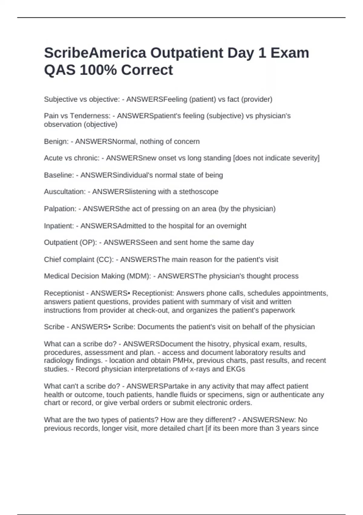 ScribeAmerica Outpatient Day 1 Exam QAS 100% Correct