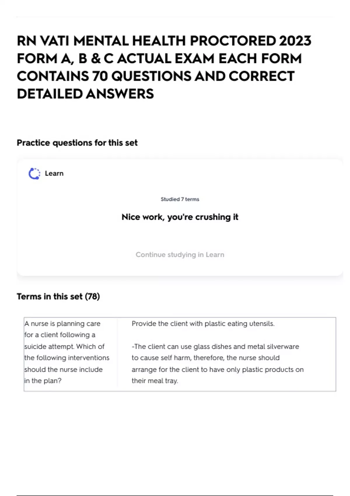 RN VATI MENTAL HEALTH PROCTORED 2023 FORM A, B & C ACTUAL EXAM EACH FORM CONTAINS 70 QUESTIONS AND CORRECT DETAILED ANSWERS