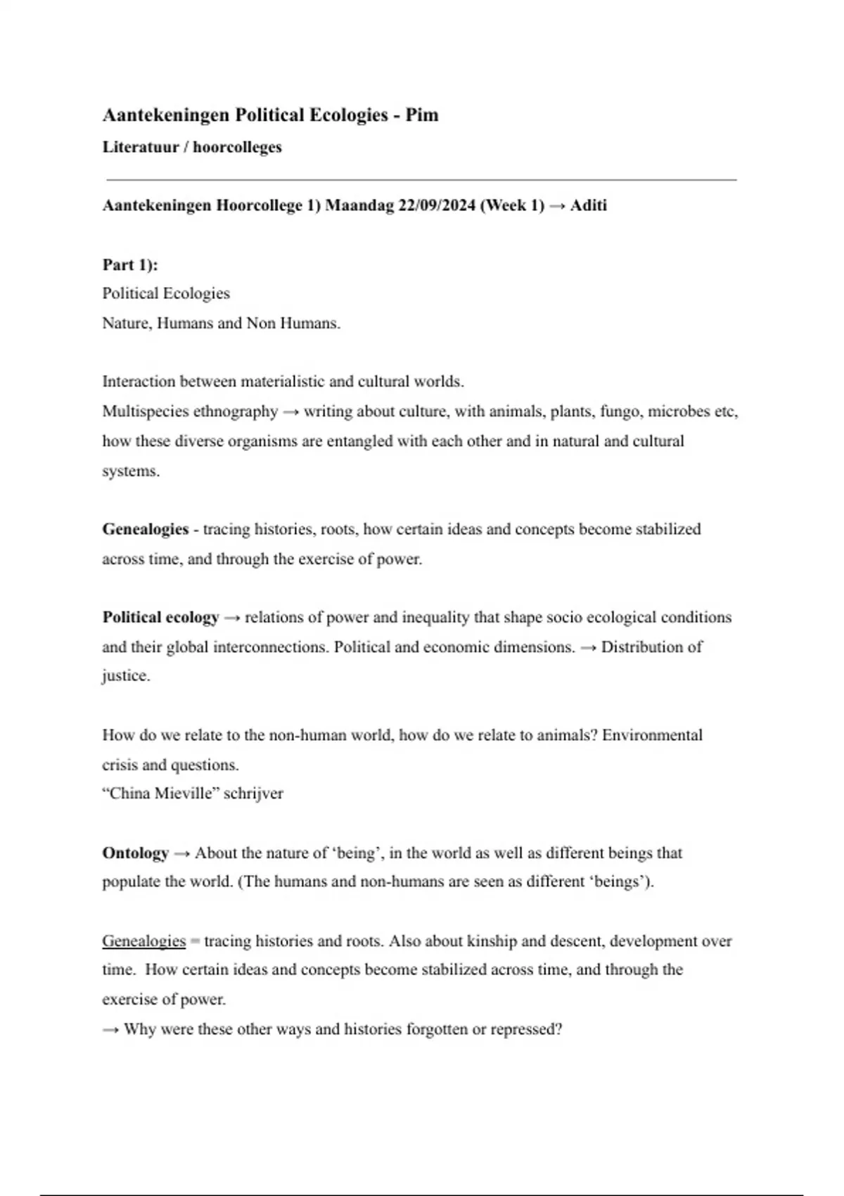 Political Ecologies - Aantekeningen Colleges (1 t/m 7) + Literatuur