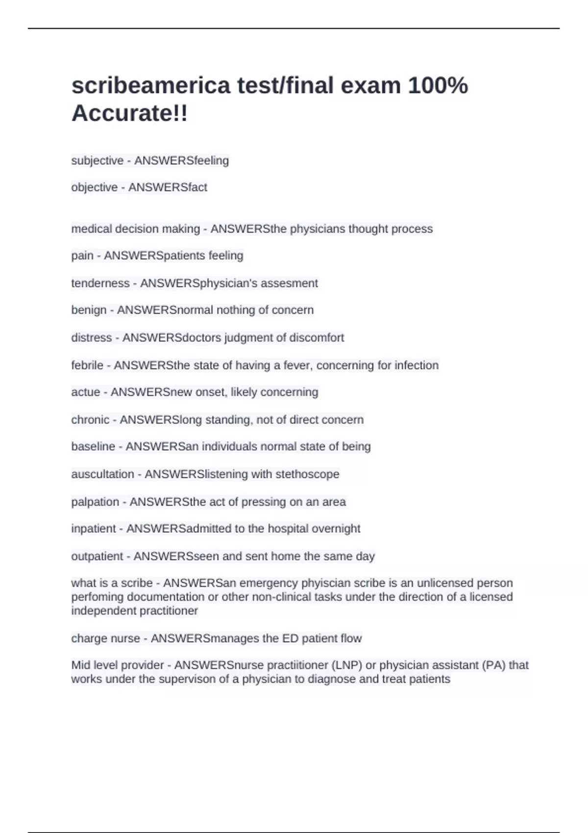 subjective - ANSWERSfeeling objective - ANSWERSfact medical decision making - ANSWERSthe physicians thought process pain - ANSWERSpatients feeling tenderness - ANSWERSphysician's assesment benign - ANSWERSnormal nothing of concern distress - ANSWERSdoctors judgment of discomfort febrile - ANSWERSthe state of having a fever, concerning for infection actue - ANSWERSnew onset, likely concerning chronic - ANSWERSlong standing, not of direct concern baseline - ANSWERSan individuals normal state of being auscultation - ANSWERSlistening with stethoscope palpation - ANSWERSthe act of pressing on an area inpatient - ANSWERSadmitted to the hospital overnight outpatient - ANSWERSseen and sent home the same day what is a scribe - ANSWERSan emergency phyiscian scribe is an unlicensed person perfoming documentation or other non-clinical tasks under the direction of a licensed independent practitioner charge nurse - ANSWERSmanages the ED patient flow