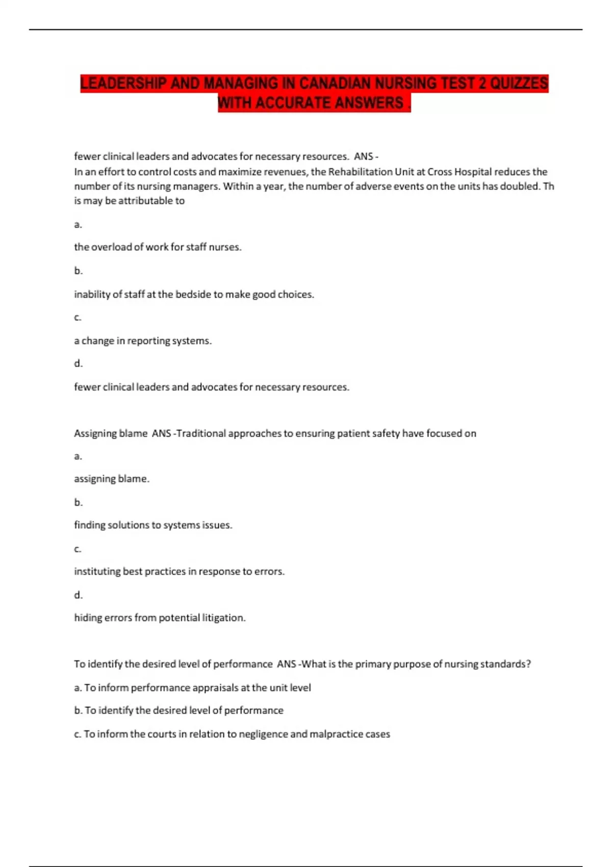 LEADERSHIP AND MANAGING IN CANADIAN NURSING TEST 2 QUIZZES WITH ACCURATE ANSWERS .