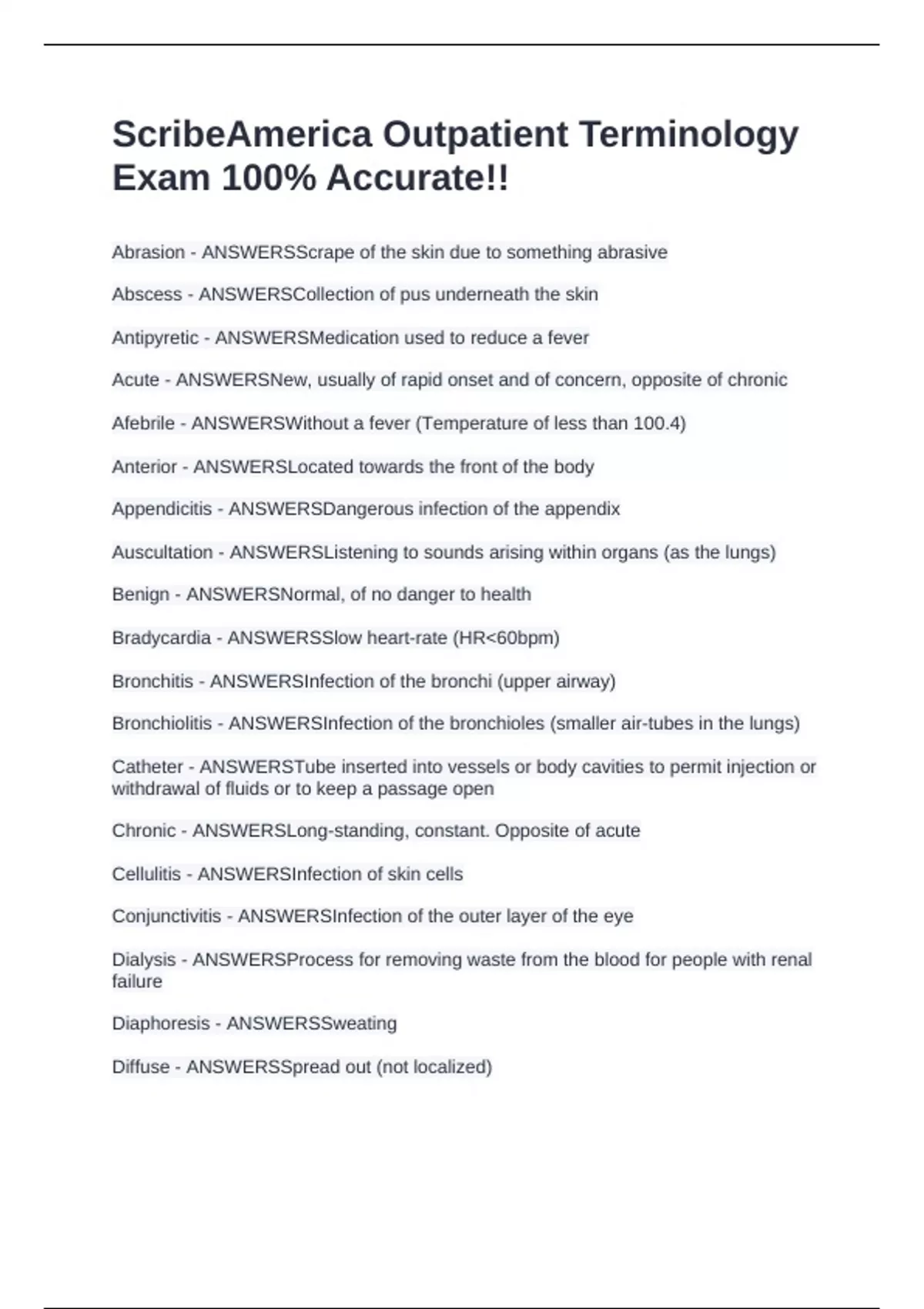 ScribeAmerica Outpatient Terminology Exam 100% Accurate!!