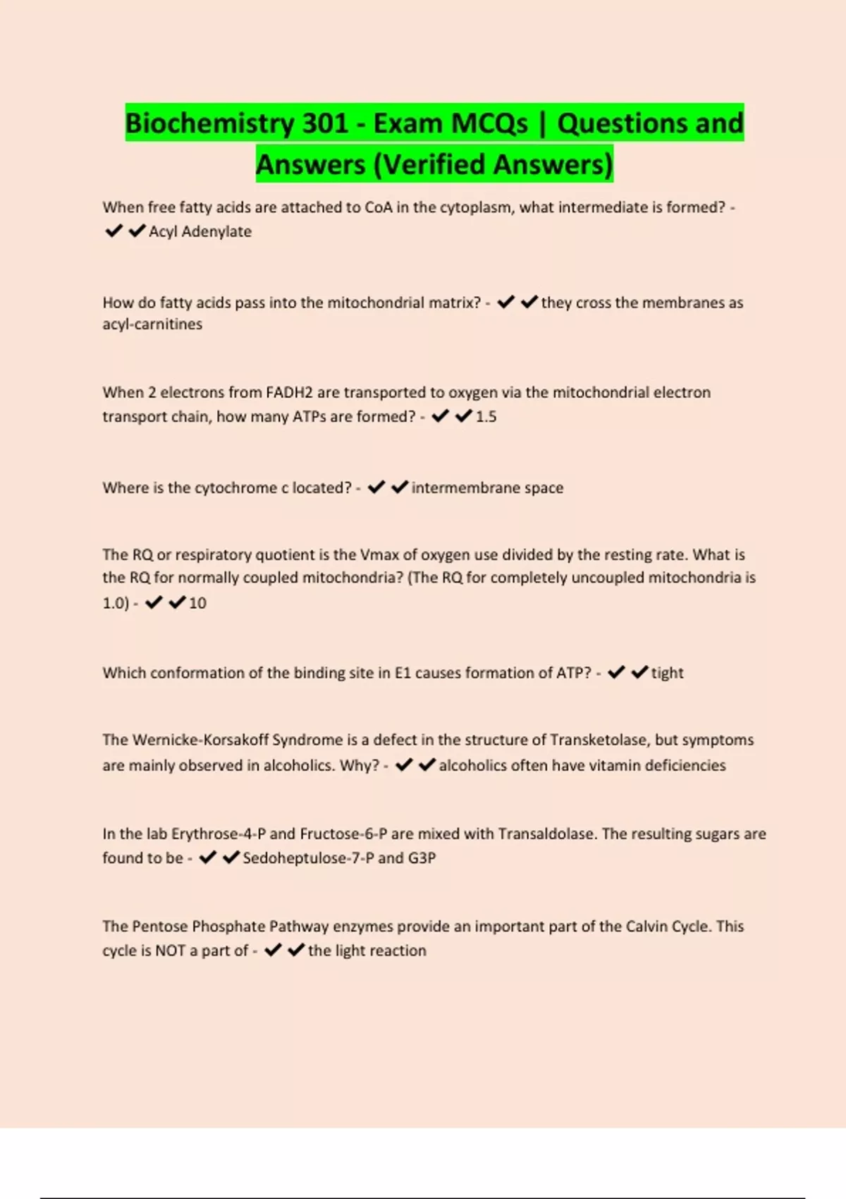 Biochemistry 301 - Exam MCQs | Questions and Answers (Verified Answers)