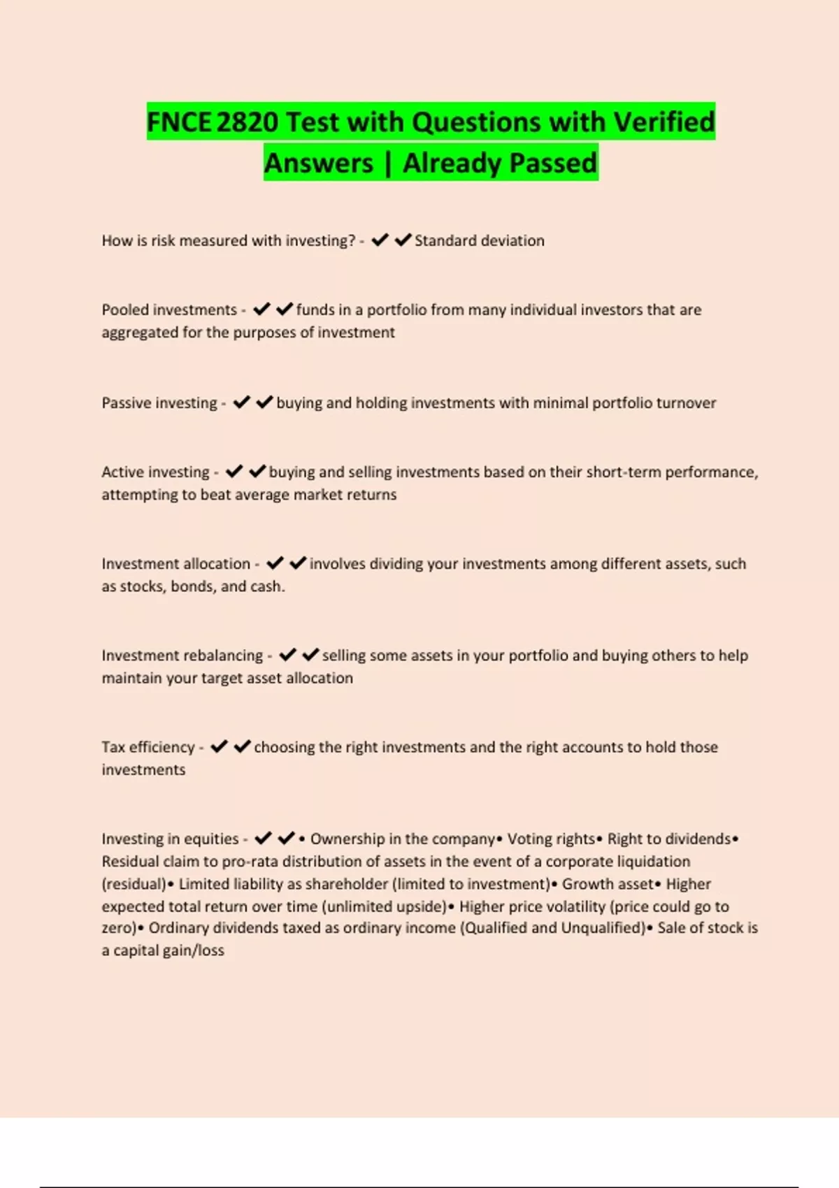 FNCE 2820 Test with Questions with Verified Answers | Already Passed