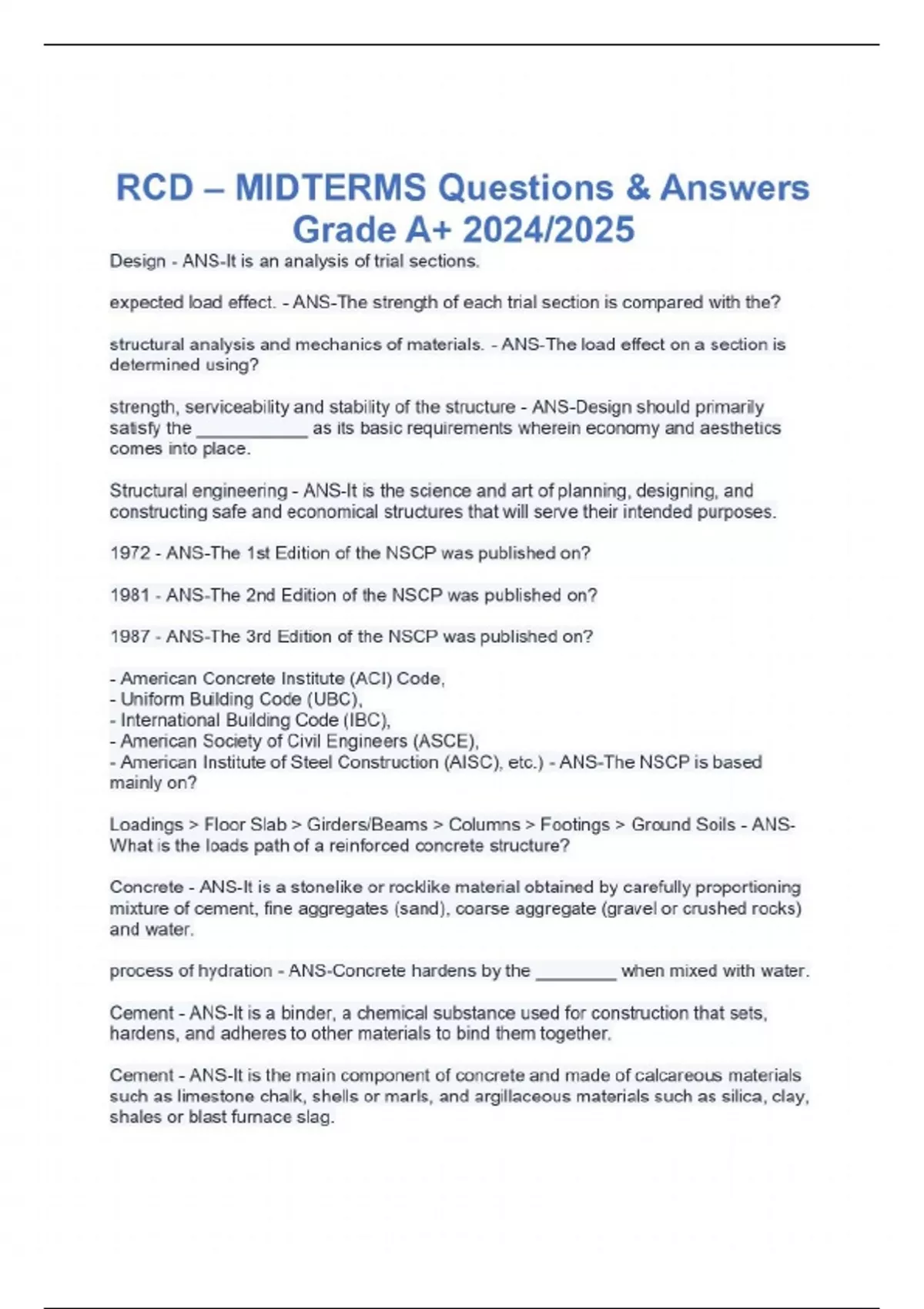RCD – MIDTERMS Questions & Answers Grade A+ 2024/2025 Design - ANS-It is an analysis of trial sections. expected load effect. - ANS-The strength of each trial section is compared with the? structural analysis and mechanics of materials. - ANS-The load effect on a section is determined using? strength, serviceability and stability of the structure - ANS-Design should primarily satisfy the ___________ as its basic requirements wherein economy and aesthetics comes into place. Structural engineering - ANS-It is the science and art of planning, designing, and constructing safe and economical structures that will serve their intended purposes. 1972 - ANS-The 1st Edition of the NSCP was published on? 1981 - ANS-The 2nd Edition of the NSCP was published on? 1987 - ANS-The 3rd Edition of the NSCP was published on? - American Concrete Institute (ACI) Code, - Uniform Building Code (UBC), - International Building Code (IBC), - American Society of Civil Engineers (ASCE), - American Institute of Steel Construction (AISC), etc.) - ANS-The NSCP is based mainly on? Loadings > Floor Slab > Girders/Beams > Columns > Footings > Ground Soils - ANS-What is the loads path of a reinforced concrete structure? Concrete - ANS-It is a stonelike or rocklike material obtained by carefully proportioning mixture of cement, fine aggregates (sand), coarse aggregate (gravel or crushed rocks) and water. process of hydration - ANS-Concrete hardens by the ________ when mixed with water. Cement - ANS-It is a binder, a chemical substance used for construction that sets, hardens, and adheres to other materials to bind them together. Cement - ANS-It is the main component of concrete and made of calcareous materials such as limestone chalk, shells or marls, and argillaceous materials such as silica, clay, shales or blast furnace slag. 2,700°F in rotary kilns - ANS-Cements are ground and heated to a fusion of? about 18-ft. in diameter and 700-ft. long. - ANS-What are the dimensions of the rotary kilns where cements are ground and heated? Shear Strength of Concrete - ANS-It is also known as the Diagonal Tension Strength 35% to 80% - ANS-The shear strength of concrete is about _________ of compressive strength. Portland Cement - ANS-It is a hydraulic cement (hardens when water is added) obtained by pulverizing clinker, consisting of hydraulic calcium silicates to which some calcium sulfate has usually been provided as an underground addition. Joseph Aspdin; 1824 - ANS-An English mason, patented Portland Cement in _________. - Type I (Ordinary Portland Cement) - Type 1P (Blended Portland Cement) - Type II (Intermediate and Modified Heat Portland Cement) - Type III (High Early Strength Portland Cement) - Type IV (Low Heat Portland Cement) - Type V (Sulfate Resistant Portland Cement) - ANS-What are the types of Portland Cement? Type I (Ordinary Portland Cement) - ANS-Type of portland cement that is most widely used in constructions and is of least costly; used for standard and ordinary all-purpose Portland cement which usually attains its strength at 28 days. Type I (Ordinary Portland Cement) - ANS-A type of portland cement that is used for general purpose? Type 1P (Blended Portland Cement) - ANS-It is a pozzolanic cement mainly used for concreting and plastering with increased long-term strength, improved workability and slump retention. Type II (Intermediate and Modified Heat Portland Cement) - ANS-It is used for large construction concrete pours where less heat is designed during concrete set. Type II (Intermediate and Modified Heat Portland Cement) - ANS-A type of Portland cement that is used for moderate sulfate resistance? Type III (High Early Strength Portland Cement) - ANS-It is very similar to Type I ordinary Portland cement but develops strength more rapidly, as early as 5 days and before 28 days than Type I Portland cement. Type III (High Early Strength Portland Cement) - ANS-It is known as high early strength cement. Type IV (Low Heat Portland Cement) - ANS-Like Type II, it is used in massive structures such as dams and retaining walls. The low heat prevents shrinkage and cracks in concrete. Type IV (Low Heat Portland Cement) - ANS-A type of Portland cement that is used for low heat of hydration? Type V (Sulfate Resistant Portland Cement) - ANS-It is used when concrete is exposed to extreme sulfate such as seawater and alkaline sulfates. This is the most expensive Portland cement. Type V (Sulfate Resistant Portland Cement) - ANS-A type of Portland cement that is used for high sulfate resistance? Coarse aggregates - ANS-It consist of gravel, crushed gravel, crushed stone, air-cooled blast furnace slag, or crushed hydraulic- cement concrete or a combination particle greater than 0.19 inch (5 mm), but generally range between 3/8 inch .......
