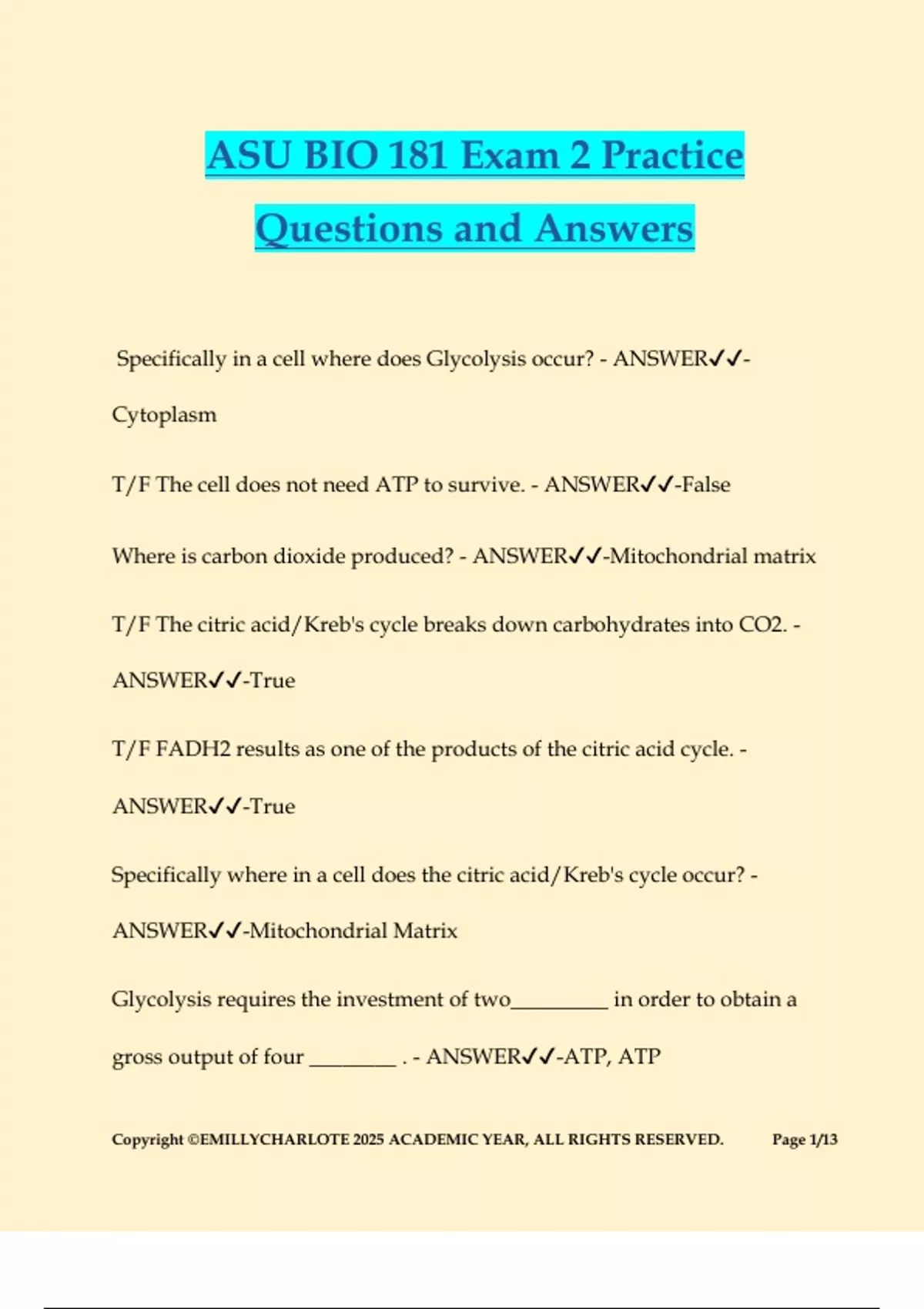ASU BIO 181 Exam 2 Practice Questions and Answers Specifically in a cell where does Glycolysis occur? - ANSWER- Cytoplasm T/F The cell does not need ATP to survive. - ANSWER-False Where is carbon dioxide produced? - ANSWER-Mitochondrial matrix T/F The citric acid/Kreb's cycle breaks down carbohydrates into CO2. - ANSWER-True T/F FADH2 results as one of the products of the citric acid cycle. - ANSWER-True Specifically where in a cell does the citric acid/Kreb's cycle occur? - ANSWER-Mitochondrial Matrix Glycolysis requires the investment of two_________ in order to obtain a gross output of four ________ . - ANSWER-ATP, ATP Copyright ©EMILLYCHARLOTE 2025 ACADEMIC YEAR, ALL RIGHTS RESERVED. Page 2/13 Does gravity have a role in some part of the lymphatic fluid flow back to the circulatory system? - ANSWER-Yes T/F Natural killer cells are part of the specific immune system. - ANSWER-False T/F You should have your appendix removed whenever possible. - ANSWER-False How does the lymph fluid return from the legs to the circulatory system? - ANSWER-A one way valve pushing it up, with the help of muscles contracting around it. If a macrophage endocytoses (i.e., eats) an antigen it can digest it and present it on a ______________ Major histocompatib
