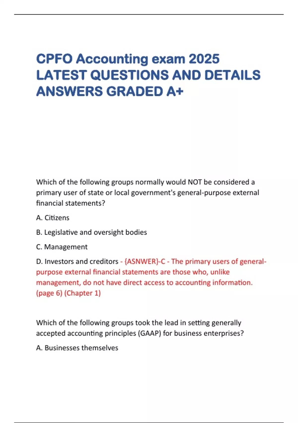 D. Investors and creditors - {ASNWER}-C - The primary users of general-