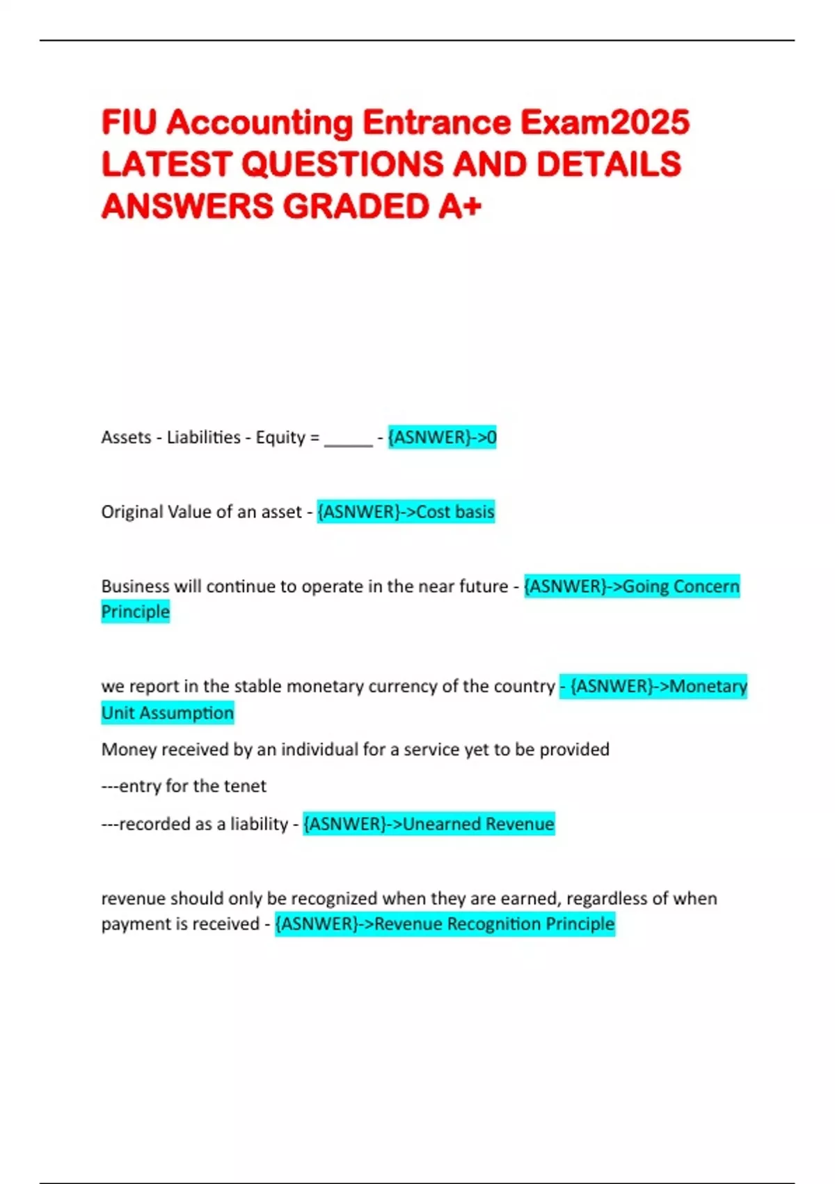 FIU Accounting Entrance Exam2025 LATEST QUESTIONS AND DETAILS ANSWERS GRADED A+