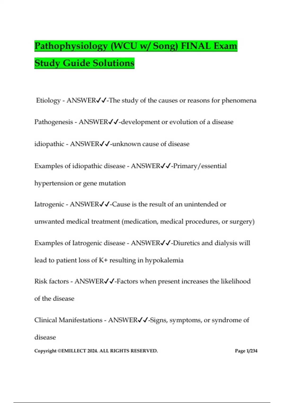 Pathophysiology (WCU w/ Song) FINAL Exam Study Guide Solutions Etiology - ANSWER-The study of the causes or reasons for phenomena Pathogenesis - ANSWER-development or evolution of a disease idiopathic - ANSWER-unknown cause of disease Examples of idiopathic disease - ANSWER-Primary/essential hypertension or gene mutation Iatrogenic - ANSWER-Cause is the result of an unintended or unwanted medical treatment (medication, medical procedures, or surgery) Examples of Iatrogenic disease - ANSWER-Diuretics and dialysis will lead to patient loss of K+ resulting in hypokalemia Risk factors - ANSWER-Factors when present increases the likelihood of the disease Clinical Manifestations - ANSWER-Signs, symptoms, or syndrome of disease Copyright ©EMILLECT 2024. ALL RIGHTS RESERVED. Page 2/234 Signs - ANSWER-objective or observed manifestation of disease, something we can see. Eg. a bruise or cut Symptoms - ANSWER-Subjective characteristics of disease felt only by the patient. Eg. Headaches and pain Syndrome - ANSWER-Set of signs and symptoms has not yet been determined exacerbation - ANSWER-a sudden increase in severity of disease, signs, or symptoms Remission - ANSWER-decrease in severity, signs, or symptoms; may indicate disease is cured Sensitivity - ANSWER-probability that a test will be positive when applied to a person with a particular condition Homeostasis - ANSWER--A state of being in which are all systems are balances around a particular ideal "set-Point" despite alteration in the body. Copyright ©EMILLECT 2024. ALL RIGHTS RESERVED. Page 3/234 -A state of equilibrium -Remains stable while being the same. Negative feed back loop - ANSWER-to sense and correct any deviation from the set point variable Allostasis - ANSWER-process by which the body reestablish or maintain homeostasis through physiologic