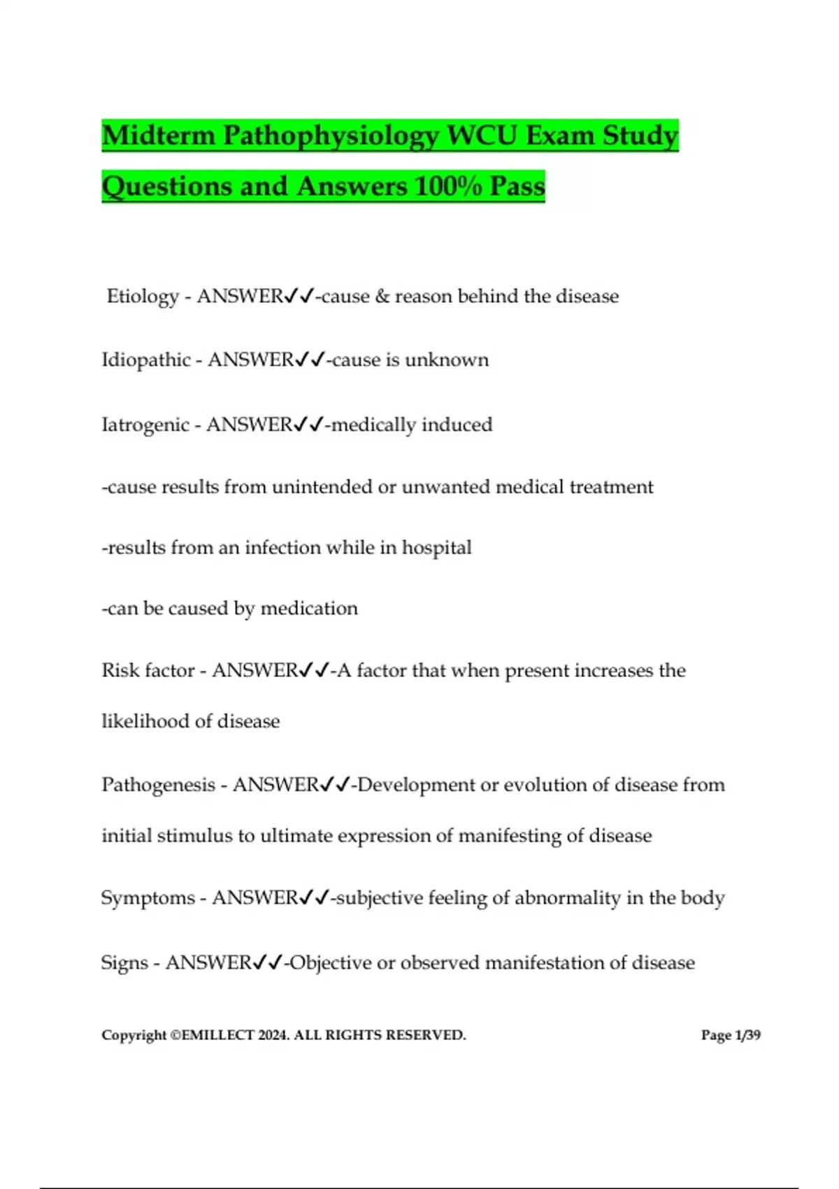 Midterm Pathophysiology WCU Exam Study Questions and Answers 100% Pass Etiology - ANSWER-cause & reason behind the disease Idiopathic - ANSWER-cause is unknown Iatrogenic - ANSWER-medically induced -cause results from unintended or unwanted medical treatment -results from an infection while in hospital -can be caused by medication Risk factor - ANSWER-A factor that when present increases the likelihood of disease Pathogenesis - ANSWER-Development or evolution of disease from initial stimulus to ultimate expression of manifesting of disease Symptoms - ANSWER-subjective feeling of abnormality in the body Signs - ANSWER-Objective or observed manifestation of disease Copyright ©EMILLECT 2024. ALL RIGHTS RESERVED. Page 2/39 Syndrome - ANSWER-a set of signs and symptoms not yet determined to delineate a disease and occur together Latent period - ANSWER-time between exposure of tissue to injurious agent and FIRST appearance of signs/or symptoms Prodomal period - ANSWER-time during which first signs and/or symptoms appear or onset of disease occurs Latent period (2) - ANSWER-Also refers to a period during an illness when signs/symptoms temporarily become mild or silent Subclinical stage - ANSWER-patient functions normally; disease processes are well established. Acute clinical course - ANSWER-short-lived; may h