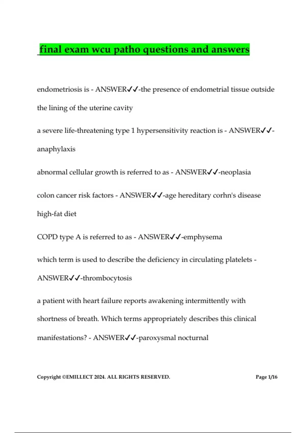 final exam wcu patho questions and answers endometriosis is - ANSWER-the presence of endometrial tissue outside the lining of the uterine cavity a severe life-threatening type 1 hypersensitivity reaction is - ANSWER- anaphylaxis abnormal cellular growth is referred to as - ANSWER-neoplasia colon cancer risk factors - ANSWER-age hereditary corhn's disease high-fat diet COPD type A is referred to as - ANSWER-emphysema which term is used to describe the deficiency in circulating platelets - ANSWER-thrombocytosis a patient with heart failure reports awakening intermittently with shortness of breath. Which terms appropriately describes this clinical manifestations? - ANSWER-paroxysmal nocturnal Copyright ©EMILLECT 2024. ALL RIGHTS RESERVED. Page 2/16 which type of shock is characterized by generalized vasodilation and peripheral pooling of blood? - ANSWER-septic neurogenic and anaphylactic how many liters of blood are circulating in the human body at any one time? - ANSWER-4-6L it is true that acute lymphoid leukemia is - ANSWER-primarily diagnosed in children 11. which statement is true about disseminated intravascular coagulation? - ANSWER-it is both a bleeding and clotting disorder which is a major determinant of diastolic blood pressure? - ANSWER- vascular resistance which cellular change is seen with chronic bronchitis? - ANSWER- increased eosinophils